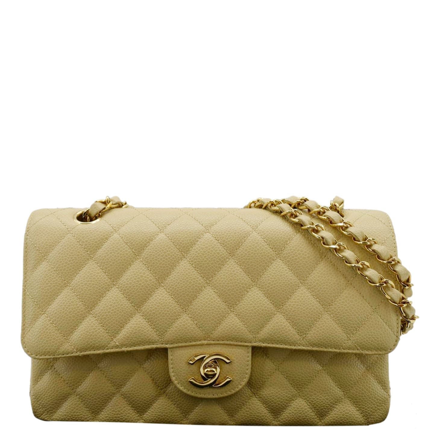 The CHANEL Classic Double Flap Quilted Caviar Leather Shoulder Bag in Cream exudes timeless elegance with its luxurious quilted caviar leather. Featuring the iconic double flap design, gold-tone hardware, and an interwoven leather and chain strap, this bag is a classic addition to any collection.