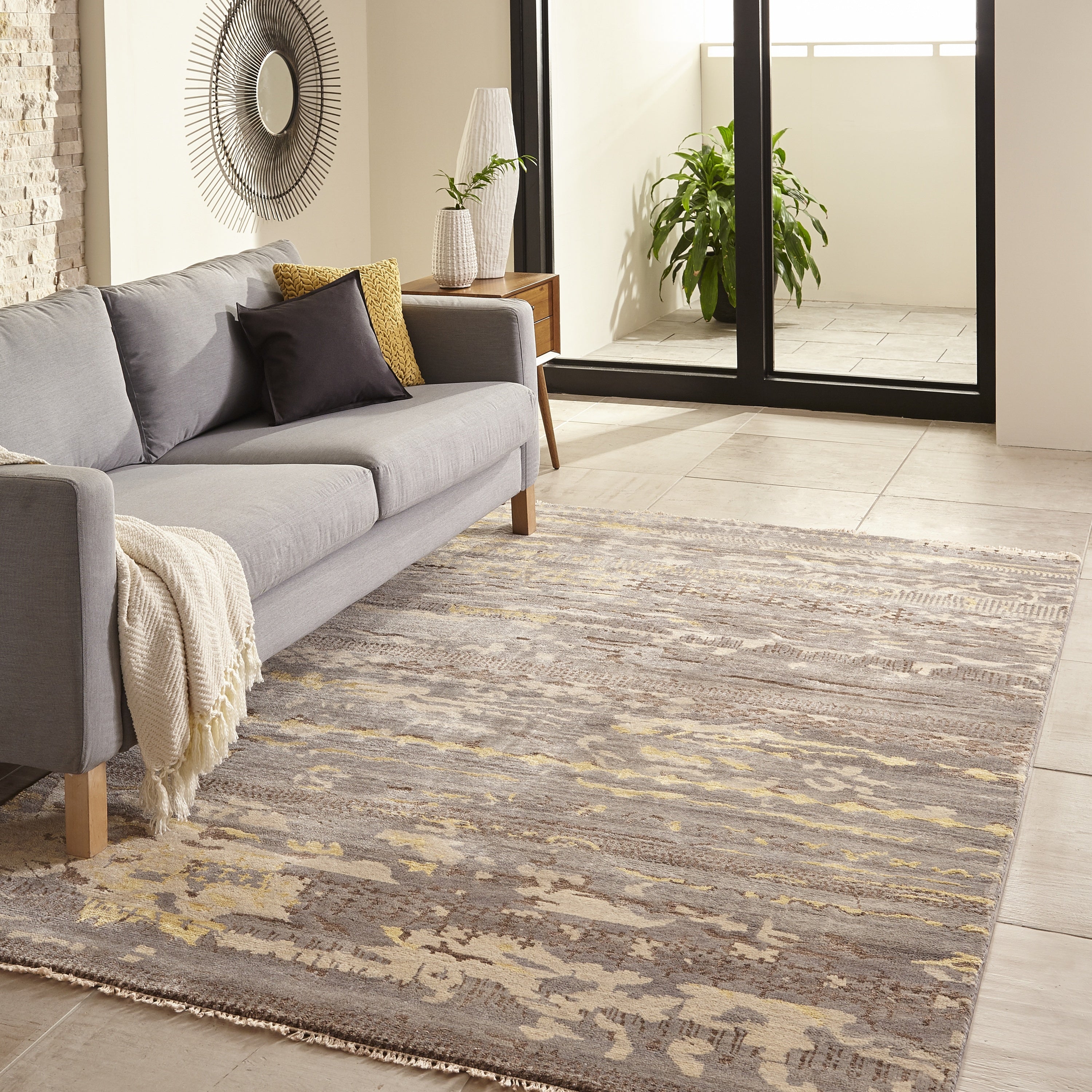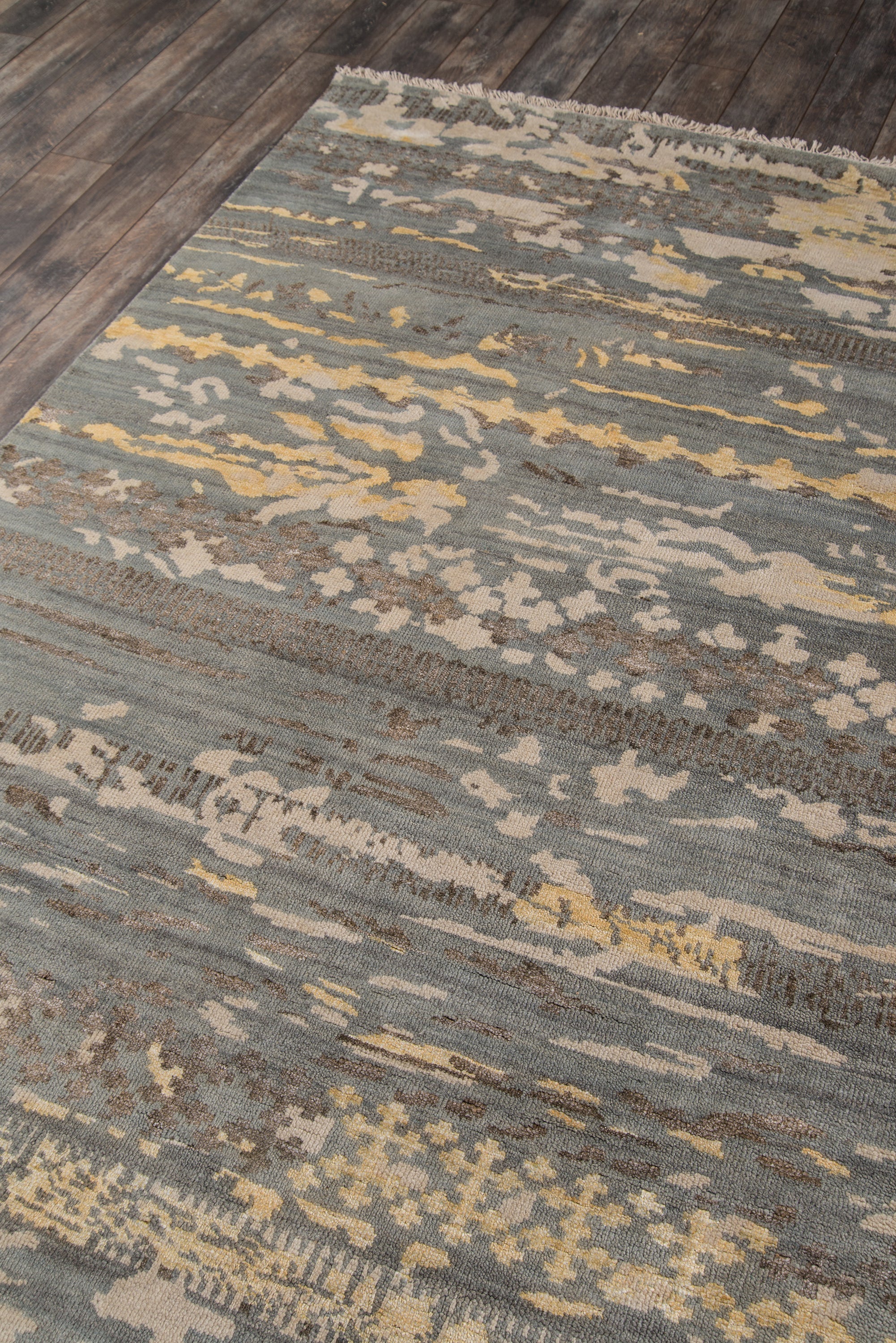 The earthy essence of this modern area rug is rooted in organic design forms. The abstract rug alternates between grounded brown striations and geometric beige and yellow patterns that reveal themselves like archeological remnants emerging from the charcoal grey field. The hand-knotted rug is crafted with care from a blend of wool and viscose fibers, each individual loop displaying exceptional depth of color and durability underfoot.