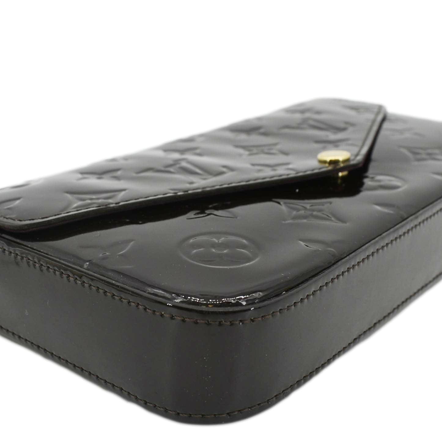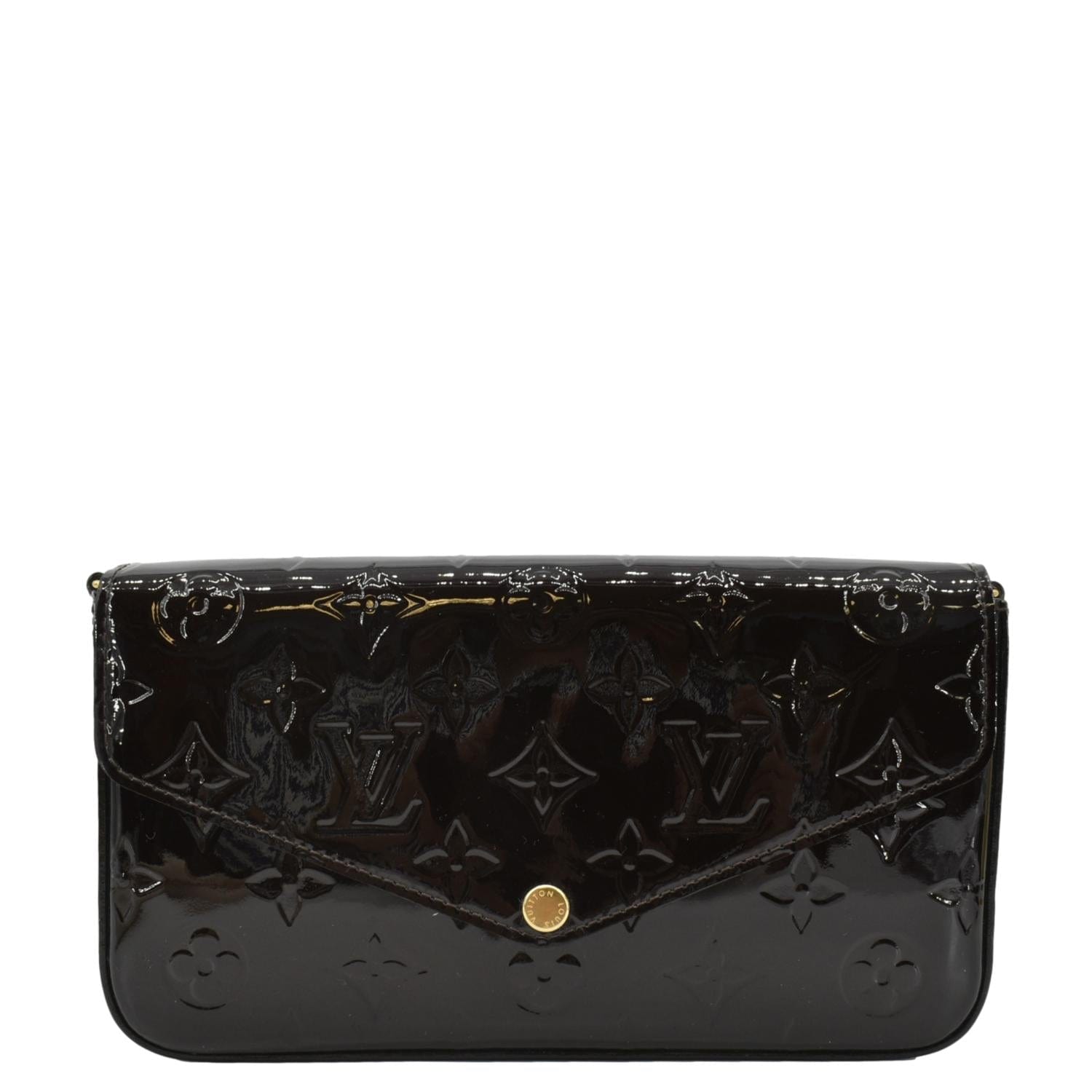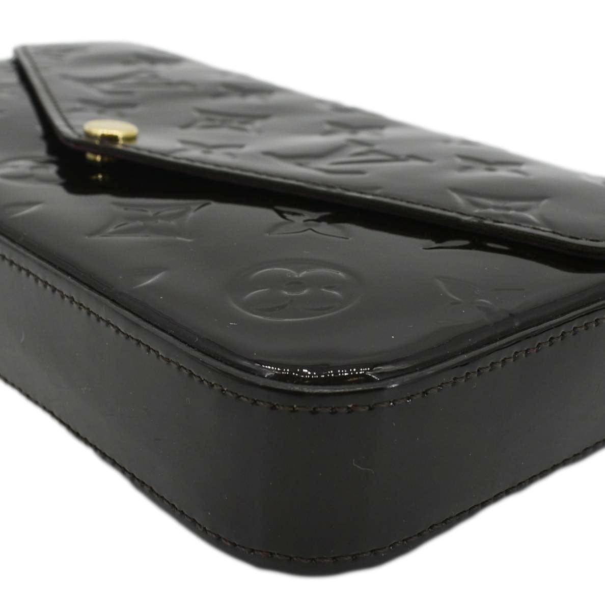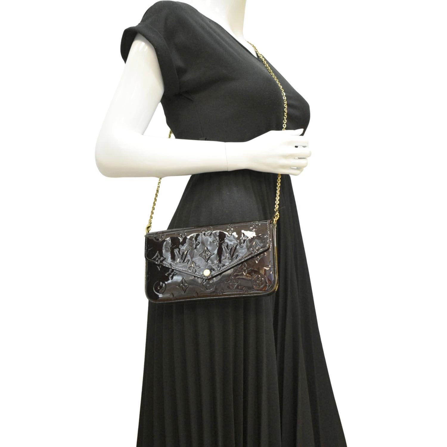 The Louis Vuitton Felicie Pochette is crafted from elegant dark purple Vernis leather, featuring a detachable chain strap, gold-tone hardware, and multiple compartments for versatile use.