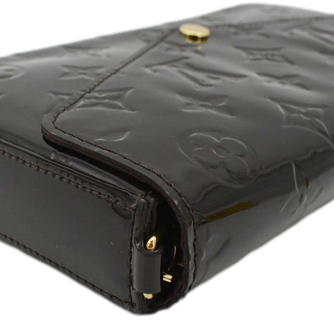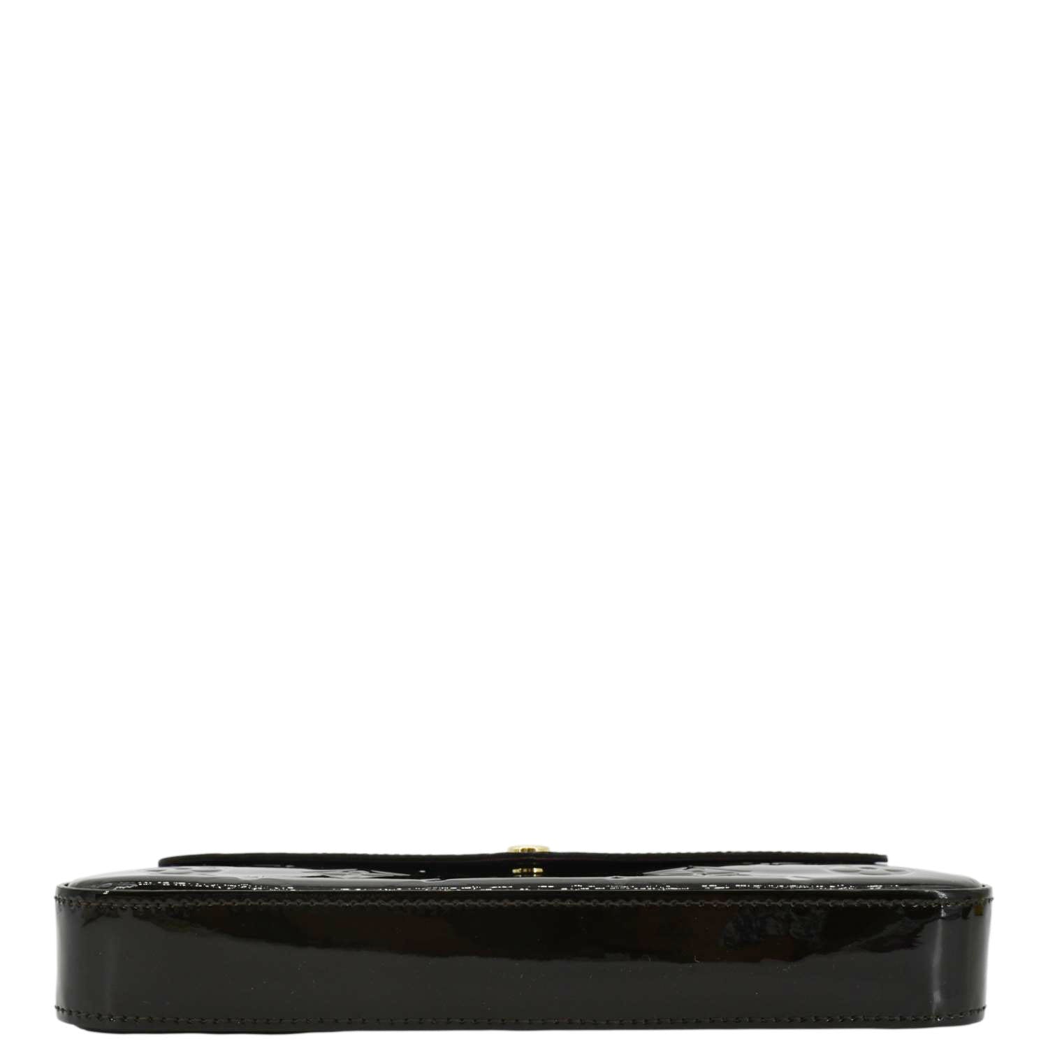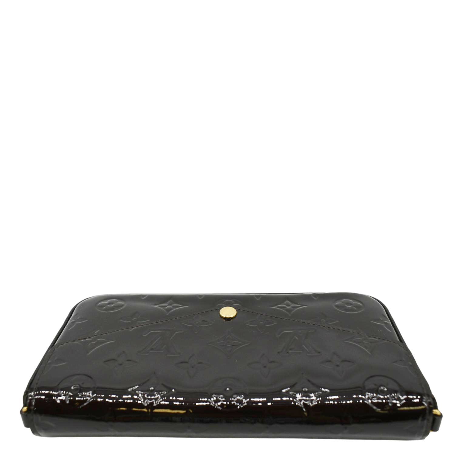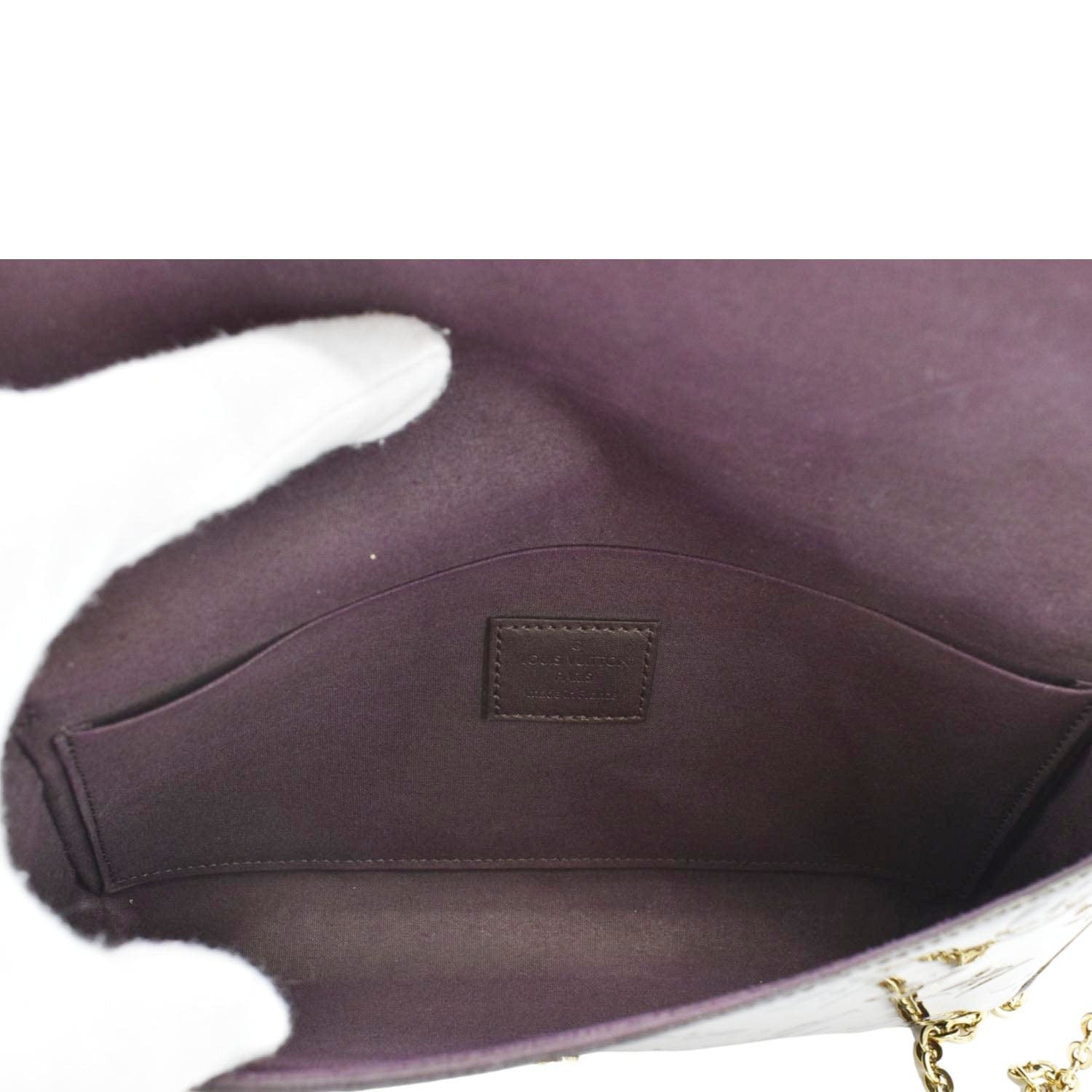 The Louis Vuitton Felicie Pochette is crafted from elegant dark purple Vernis leather, featuring a detachable chain strap, gold-tone hardware, and multiple compartments for versatile use.