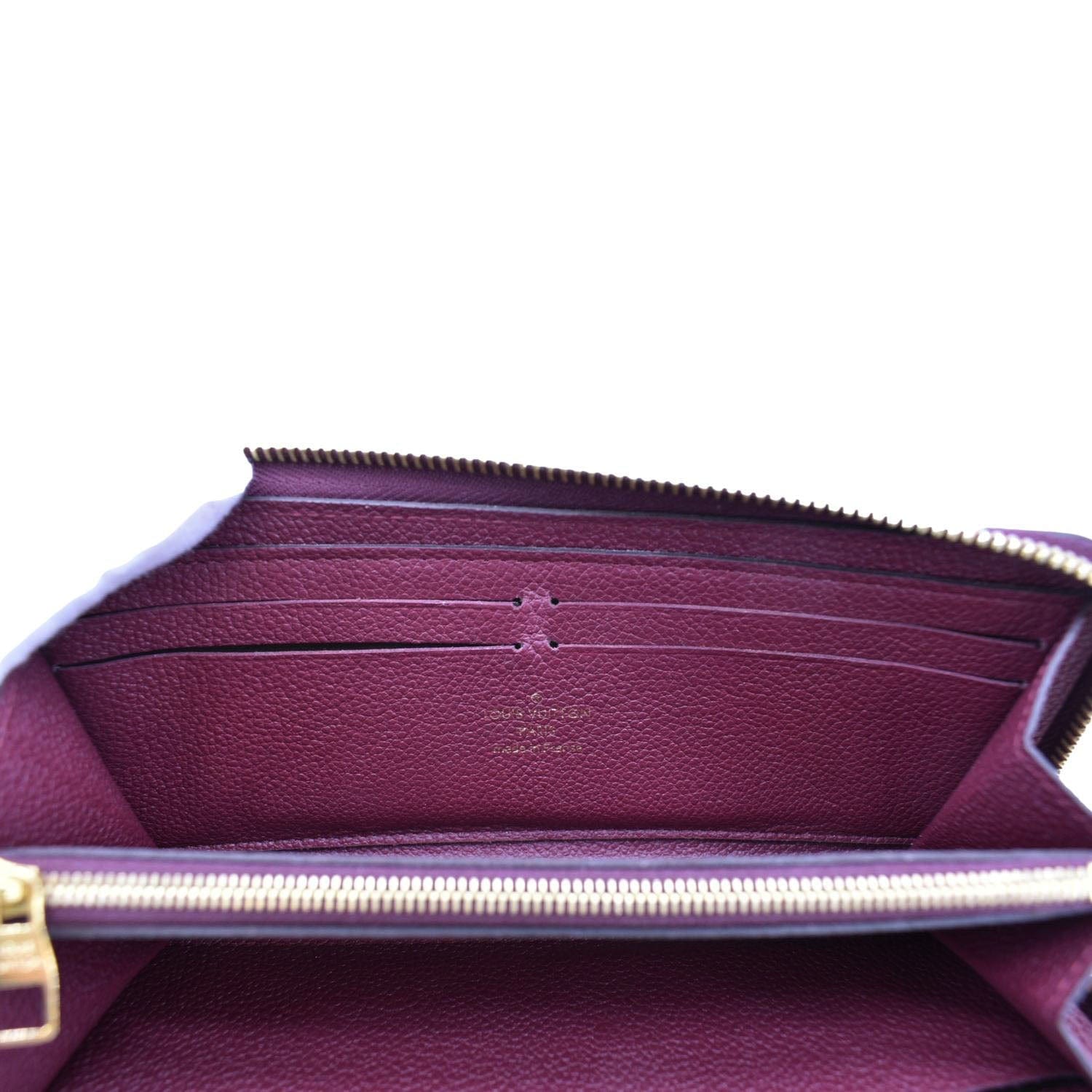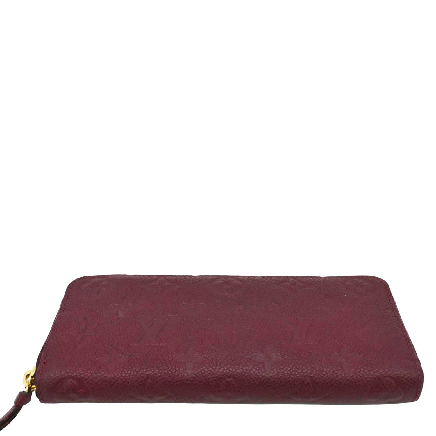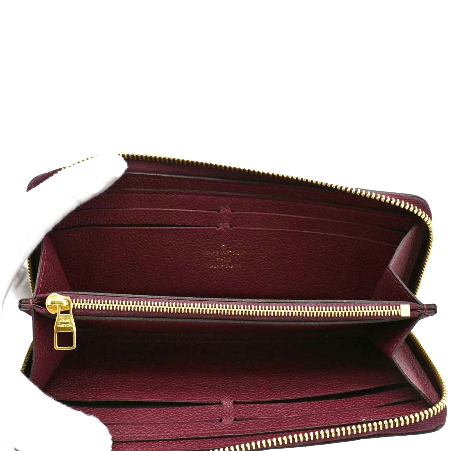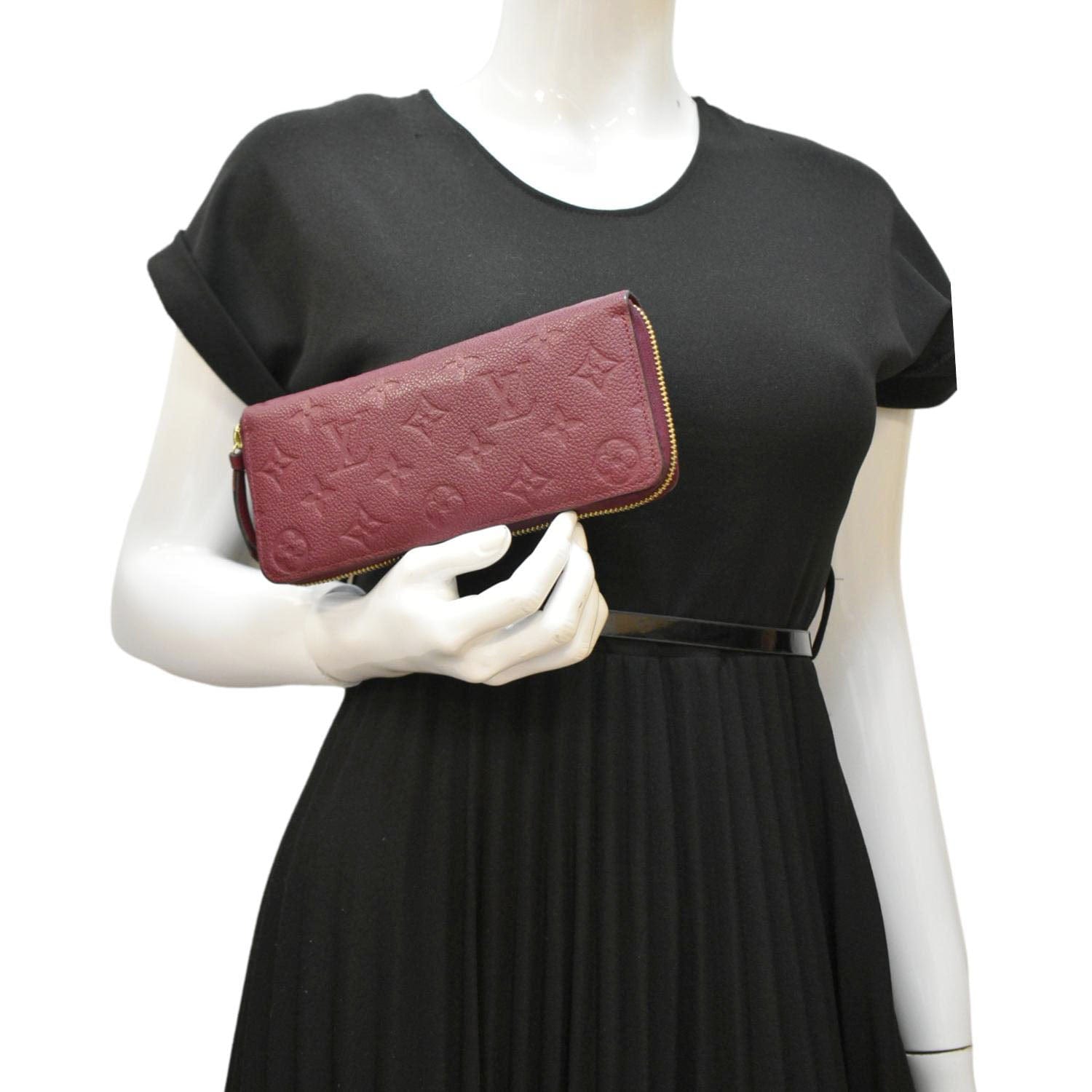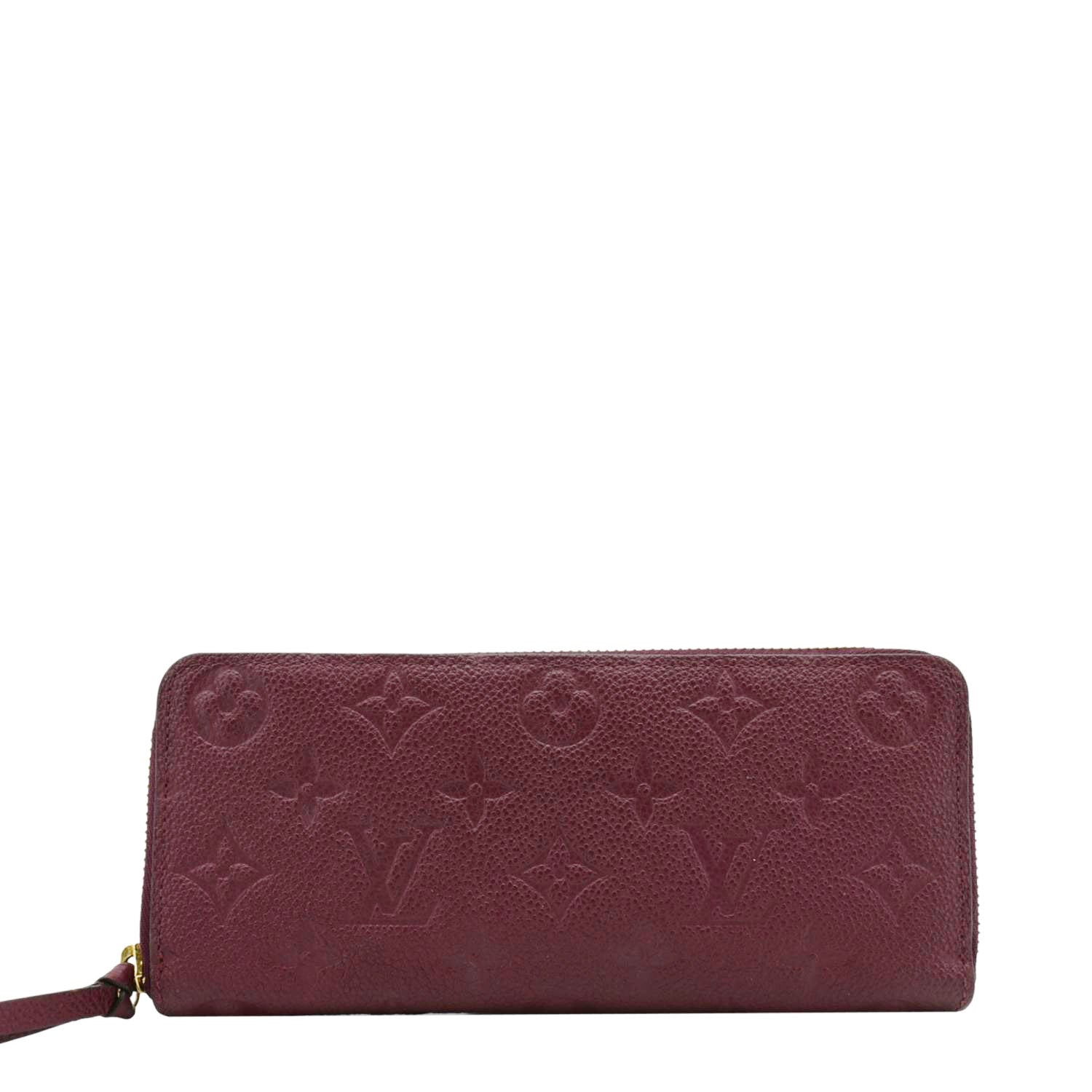 The Louis Vuitton Clemence Empreinte Leather Wallet in Maroon is crafted from luxurious Monogram Empreinte leather, featuring a zip-around closure, multiple card slots, and ample space for bills and coins.