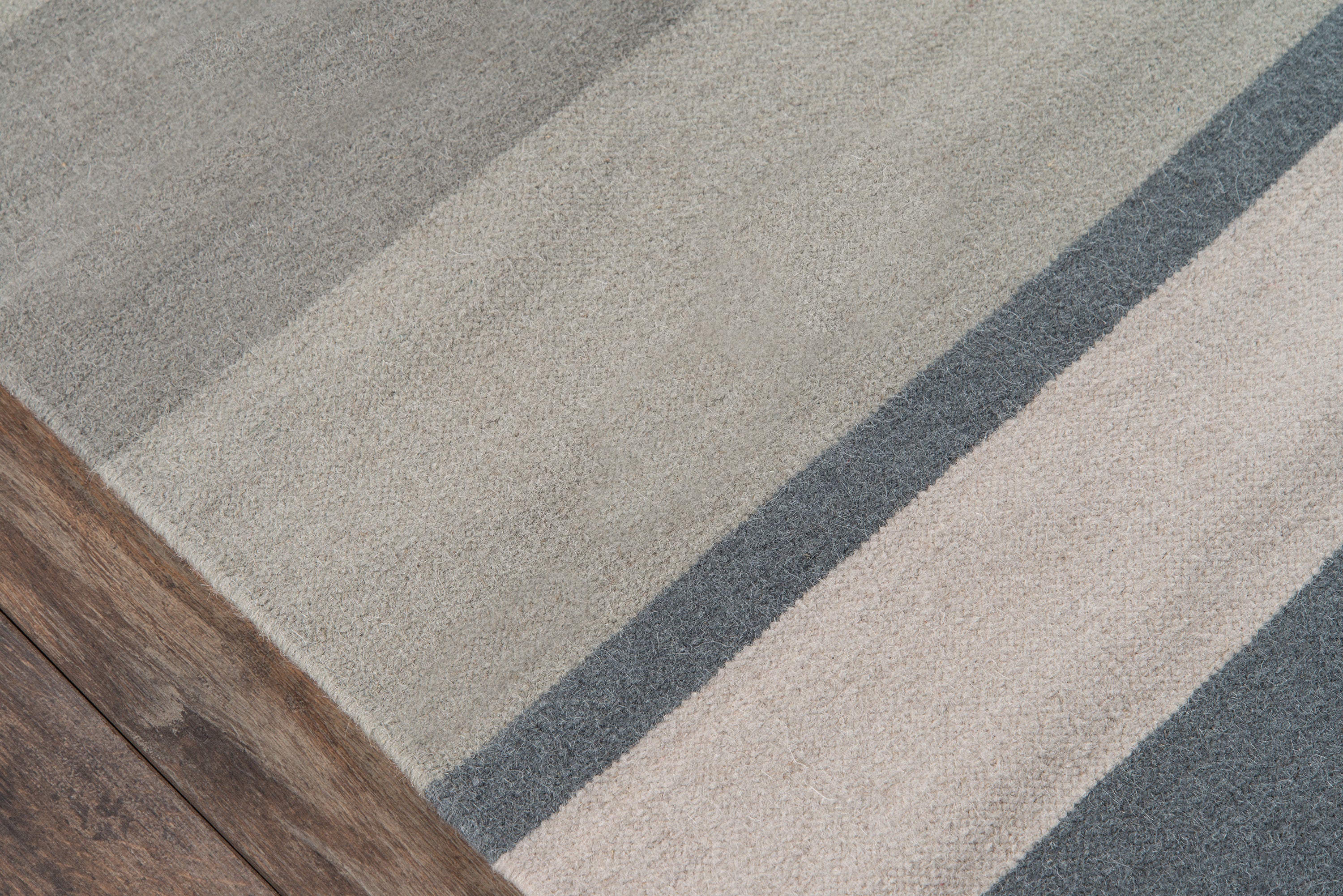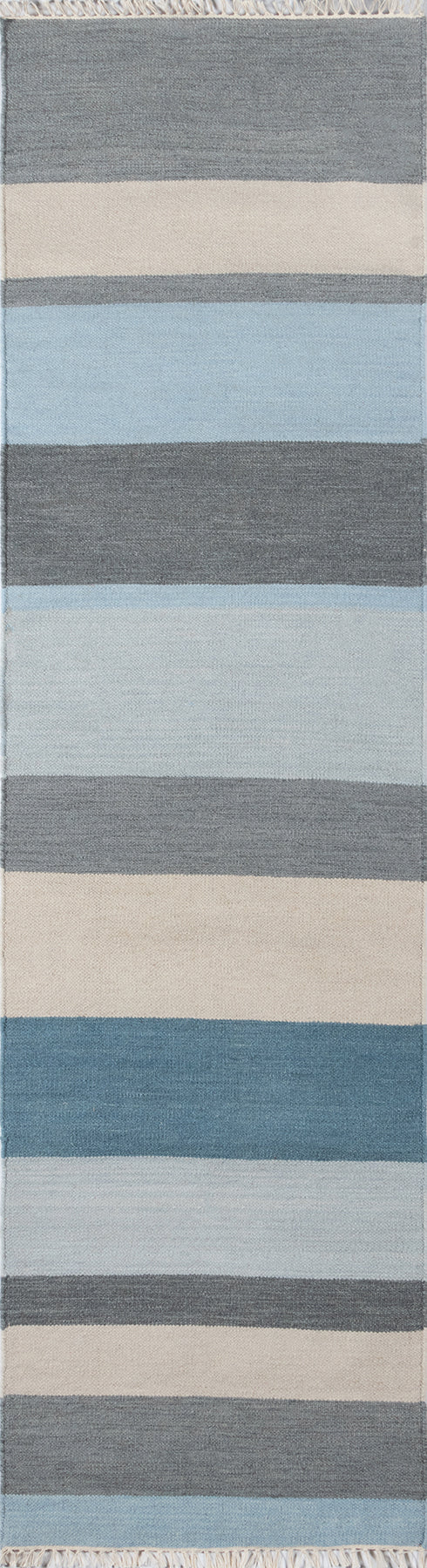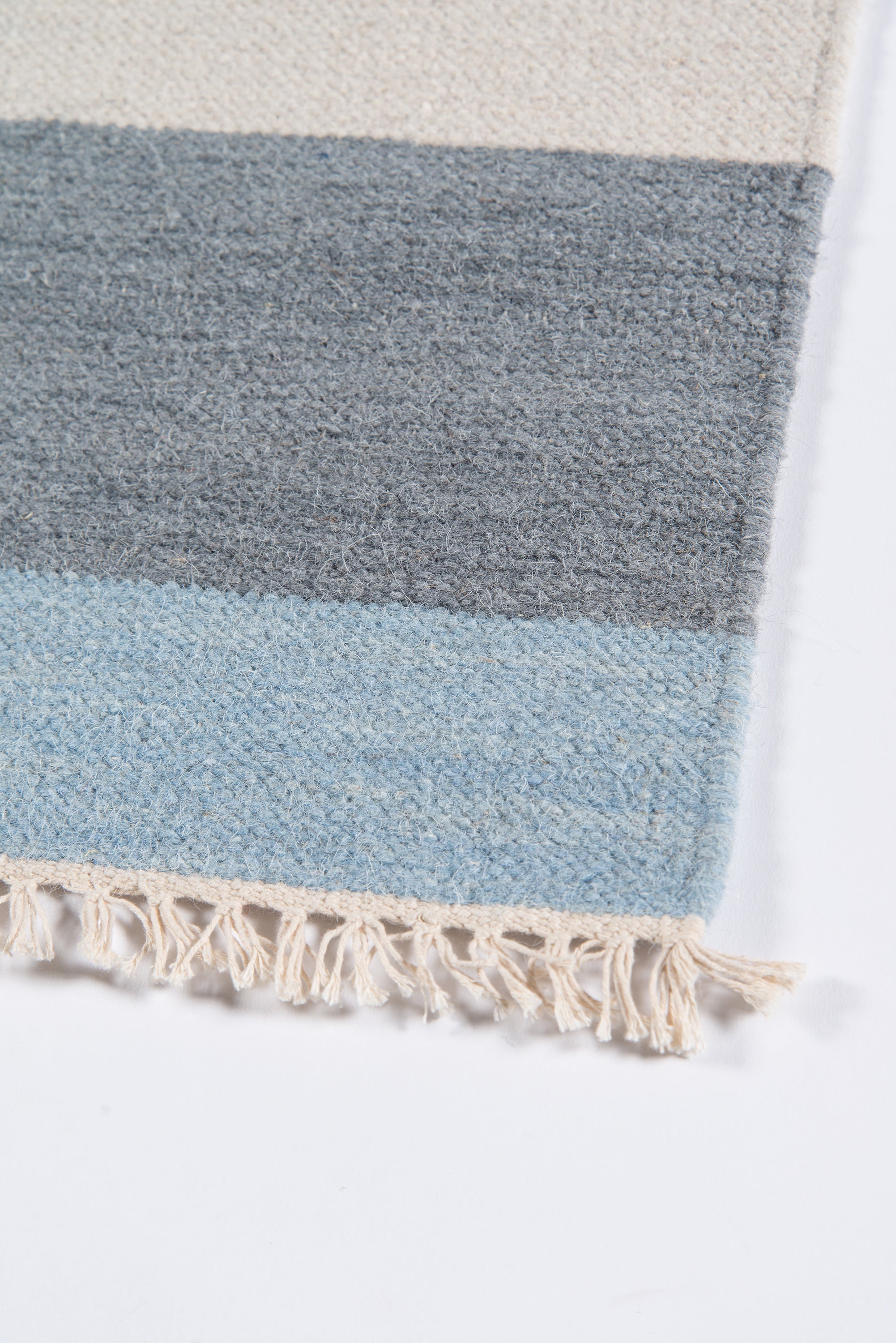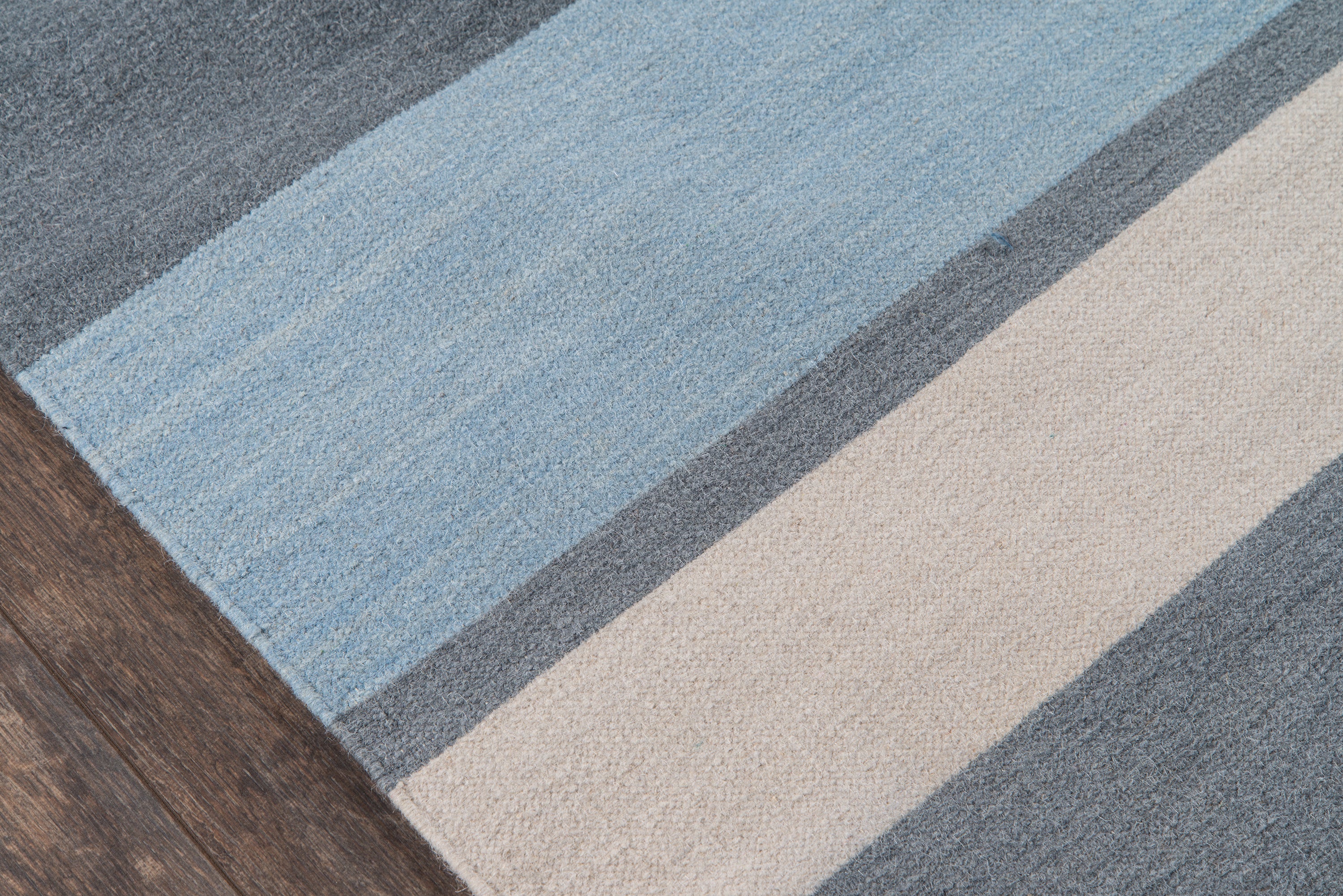 The bold lines of this traditional area rug make a subtle statement with a stripe. Horizontal bands of blue, gray and ivory traverse the rectangular rug field in varying widths that transform the norms of traditional linear patterns. Natural wool fibers hold up beautifully under heavy floor traffic while hand woven craftsmanship adds a true artisanal touch to this decorative floorcovering.