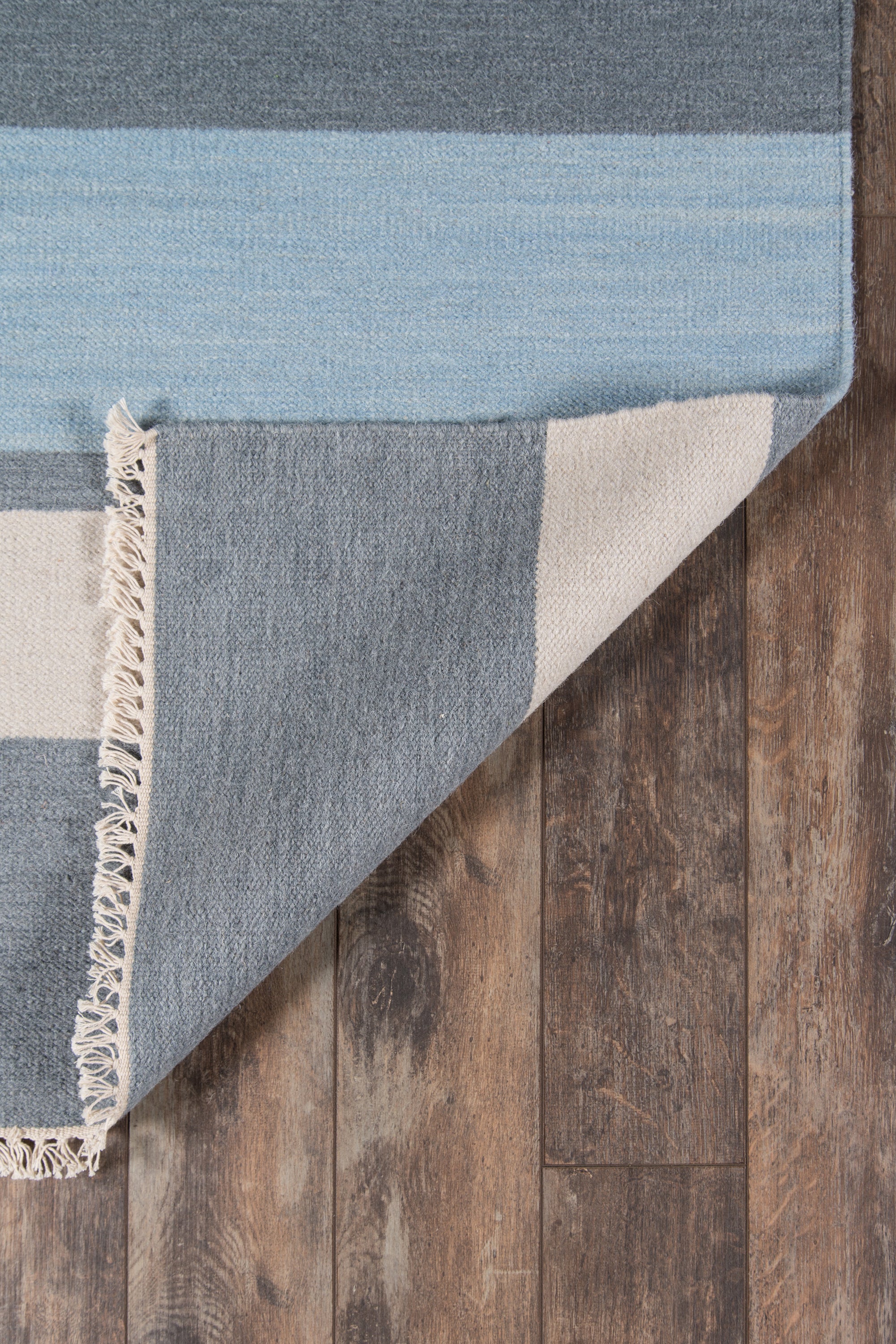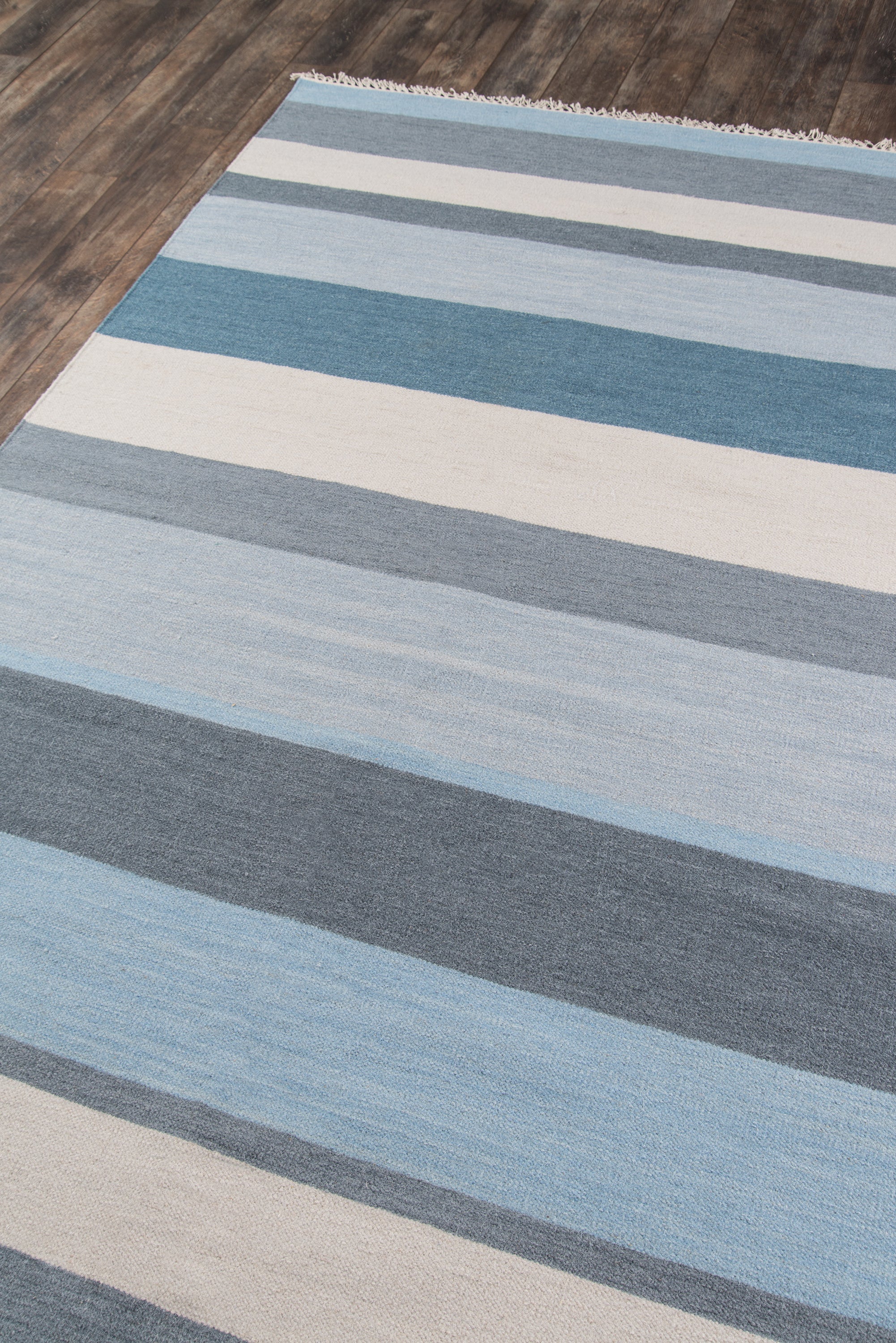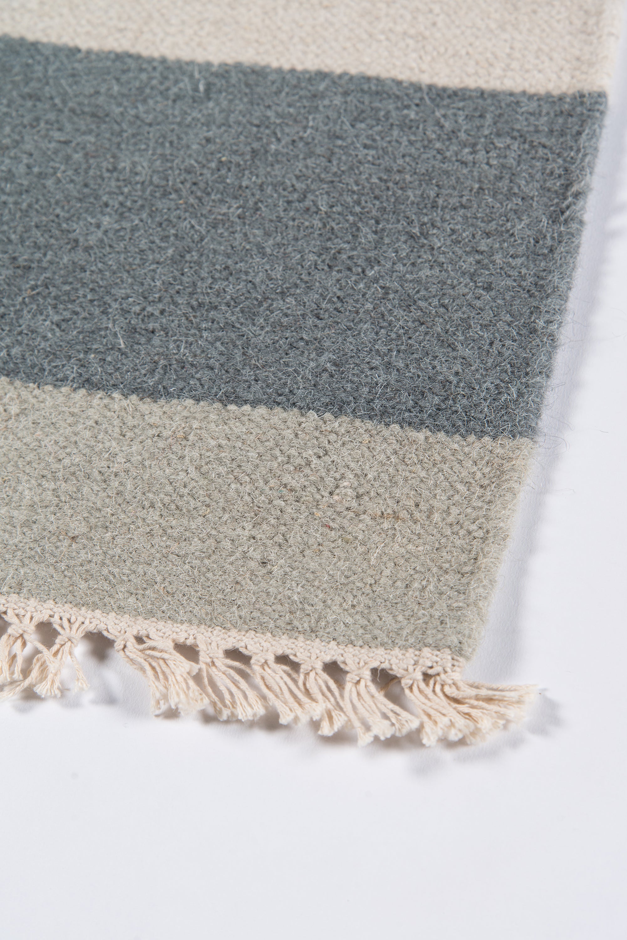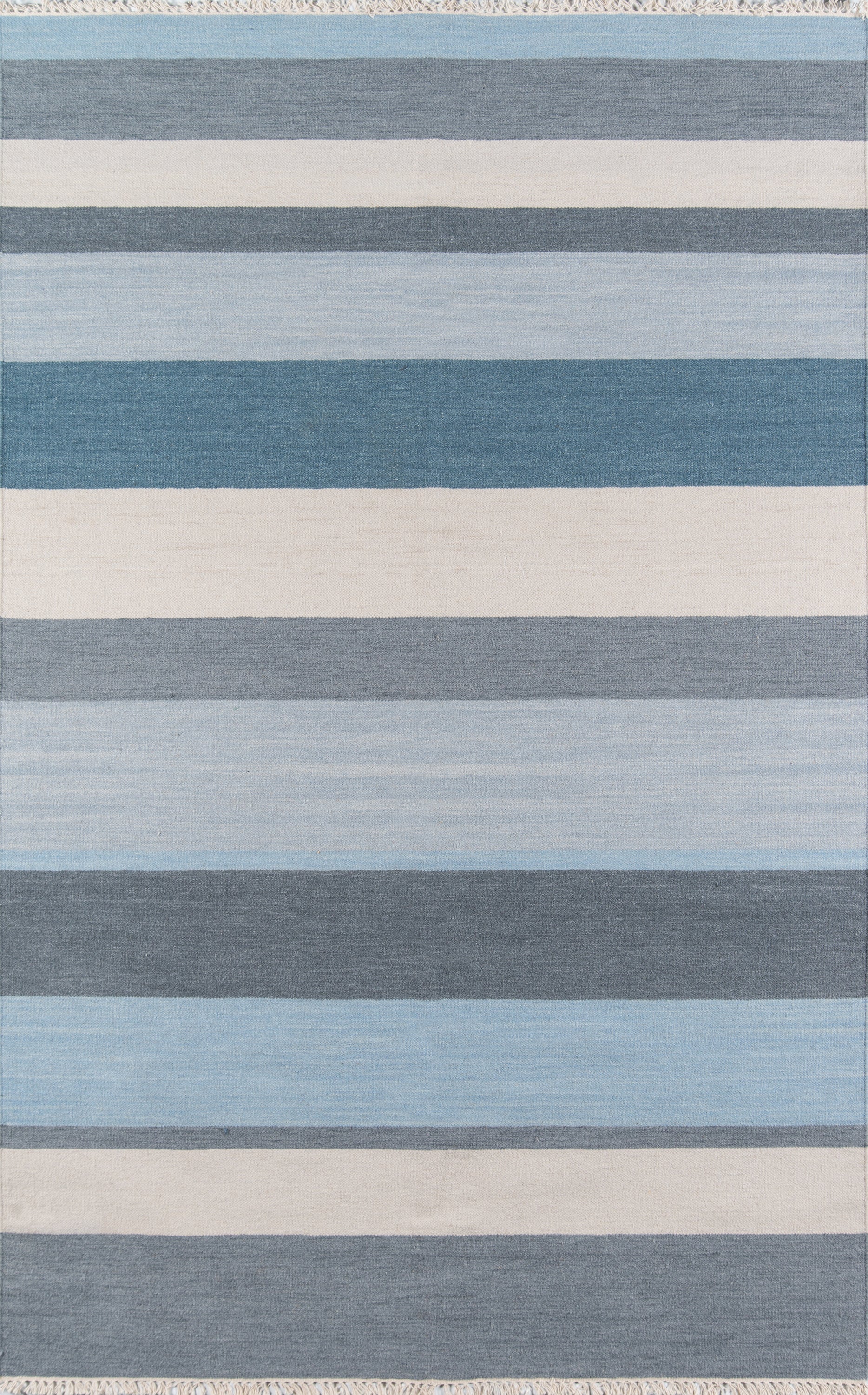 The bold lines of this traditional area rug make a subtle statement with a stripe. Horizontal bands of blue, gray and ivory traverse the rectangular rug field in varying widths that transform the norms of traditional linear patterns. Natural wool fibers hold up beautifully under heavy floor traffic while hand woven craftsmanship adds a true artisanal touch to this decorative floorcovering.
