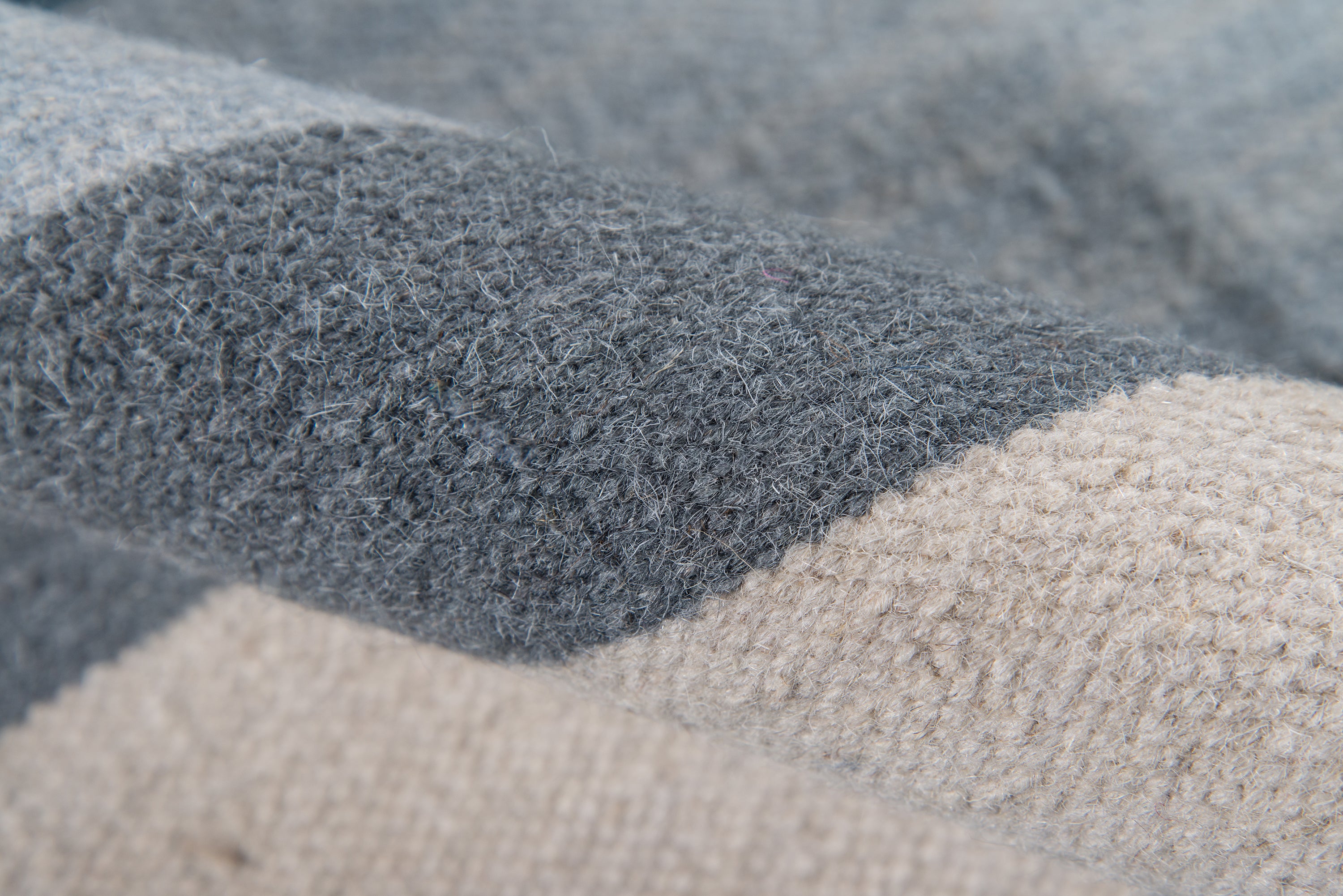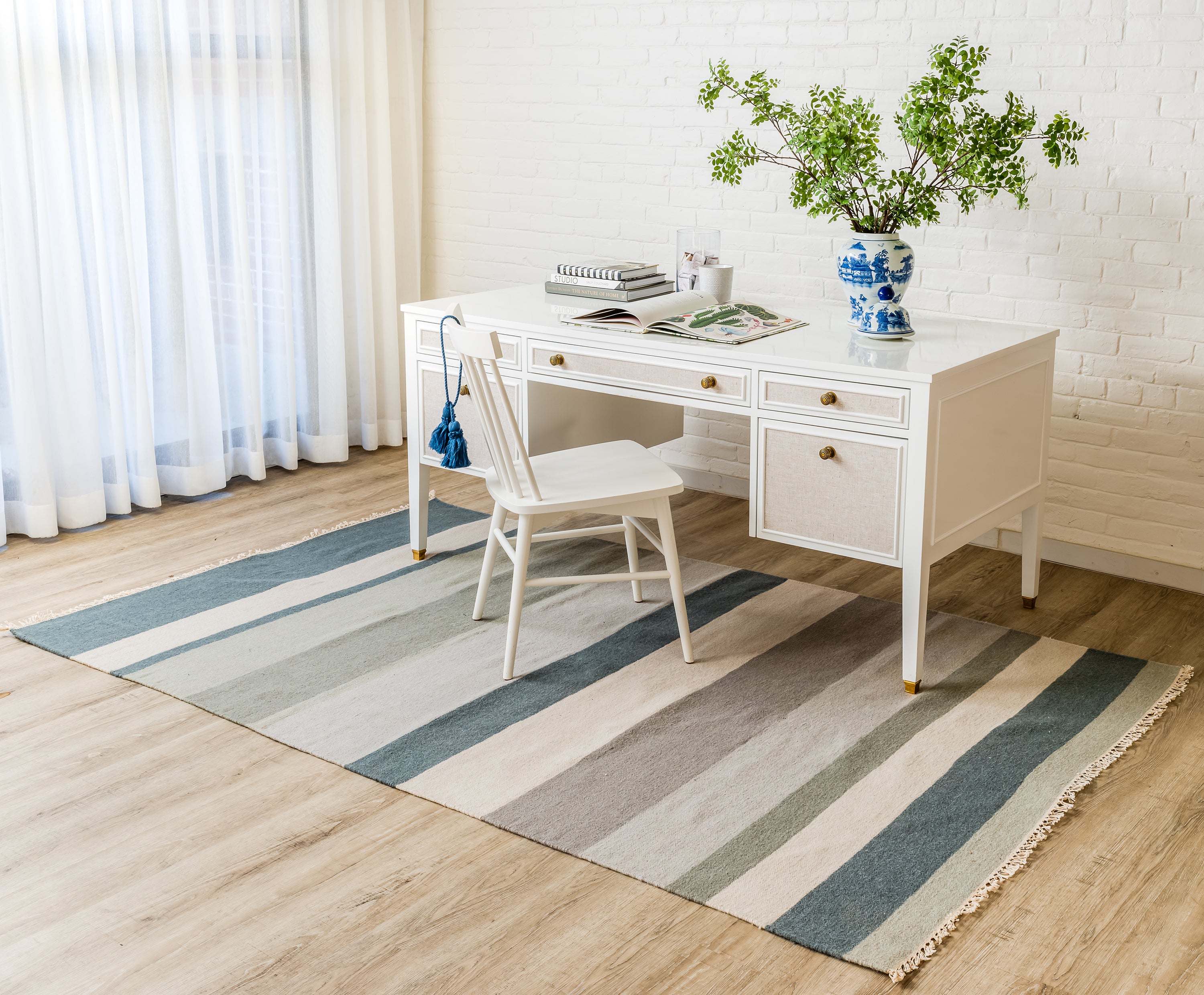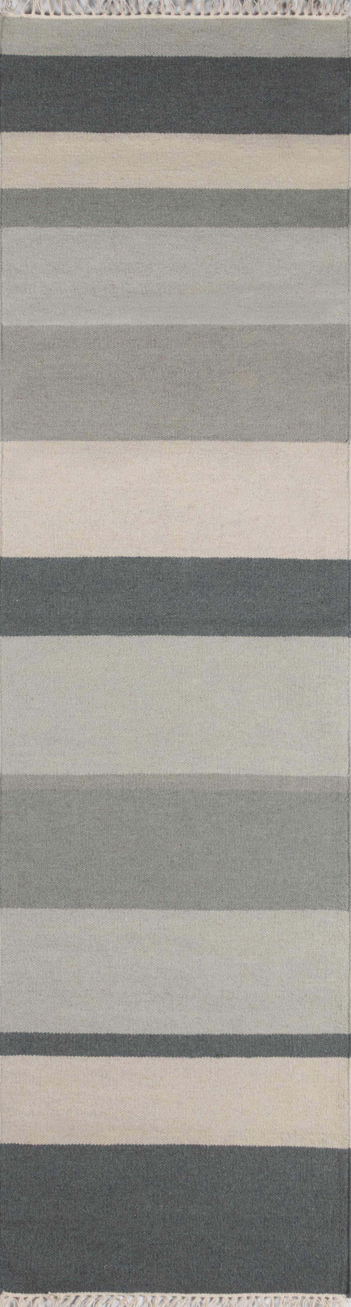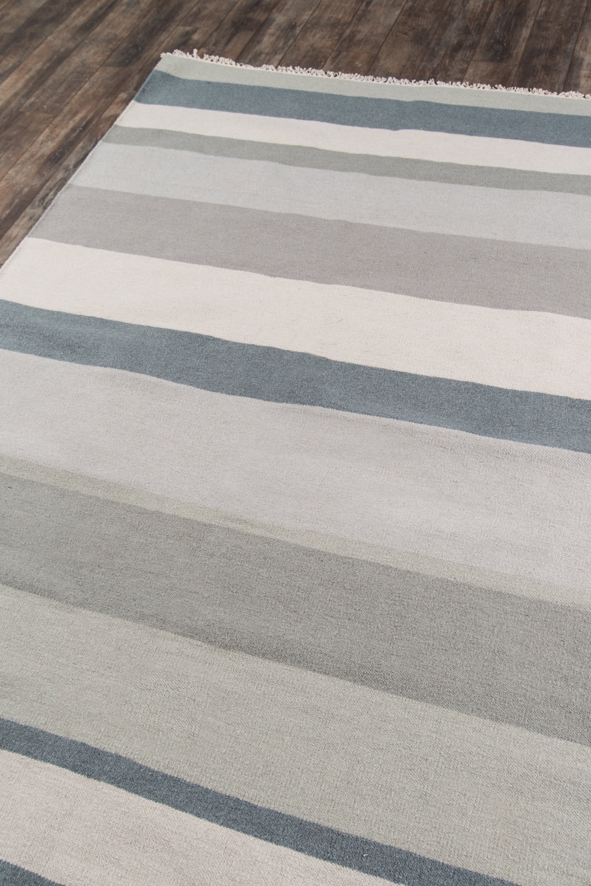 The bold lines of this traditional area rug make a subtle statement with a stripe. Horizontal bands of blue, gray and ivory traverse the rectangular rug field in varying widths that transform the norms of traditional linear patterns. Natural wool fibers hold up beautifully under heavy floor traffic while hand woven craftsmanship adds a true artisanal touch to this decorative floorcovering.