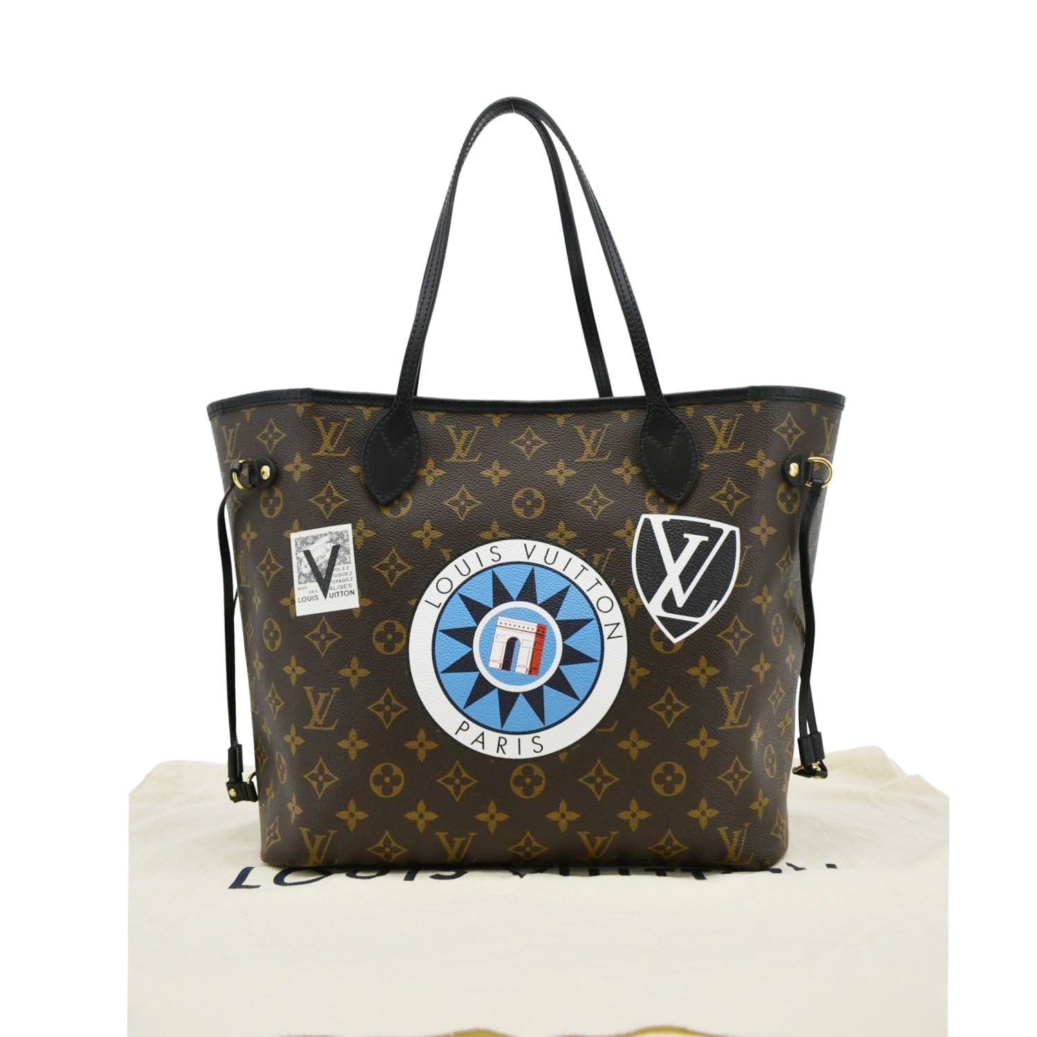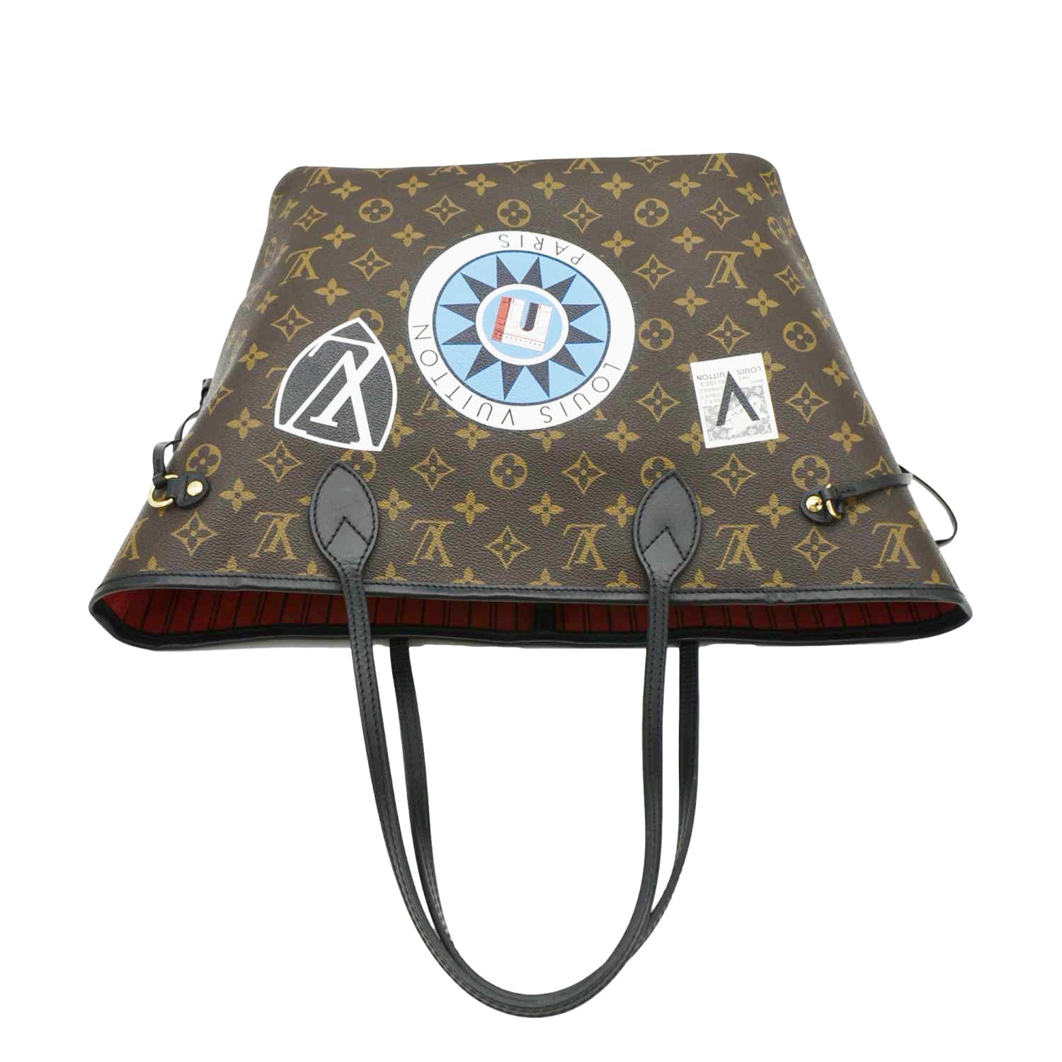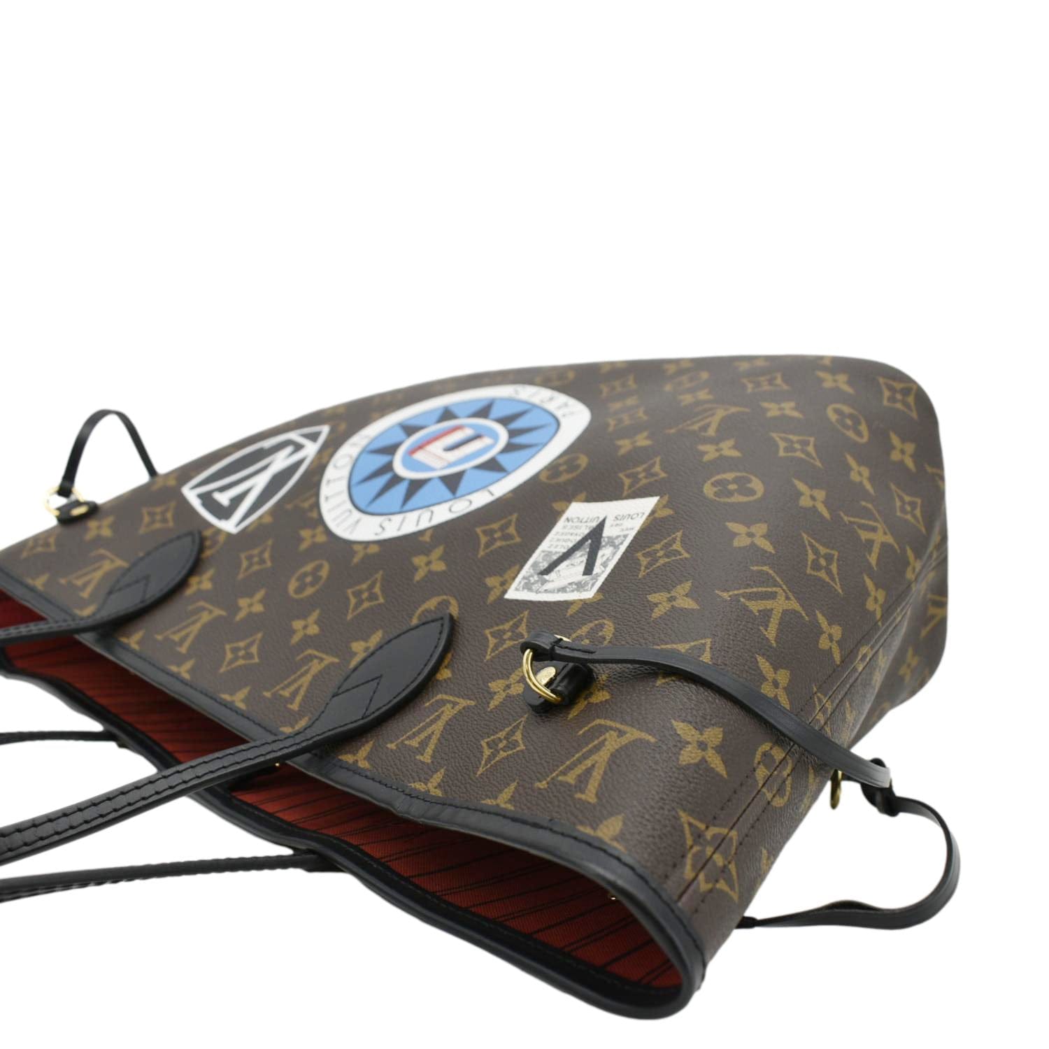The LOUIS VUITTON Neverfull World Tour Monogram Canvas Tote Bag in Brown is a stylish and spacious bag featuring the iconic Monogram canvas adorned with playful travel-inspired stickers. Its roomy interior and versatile design make it perfect for everyday use.