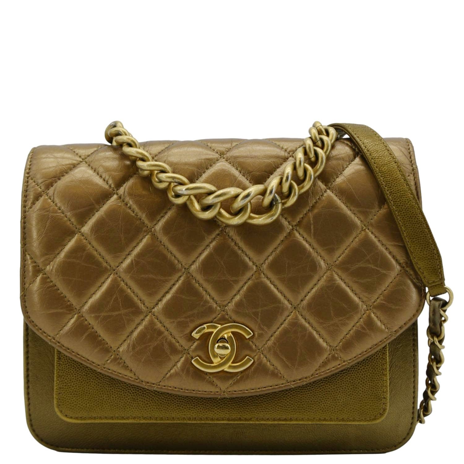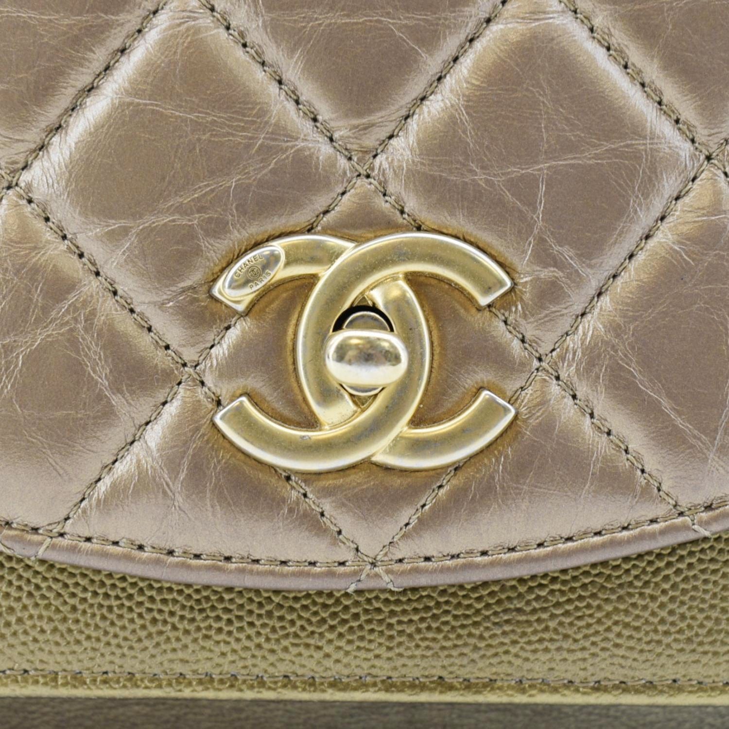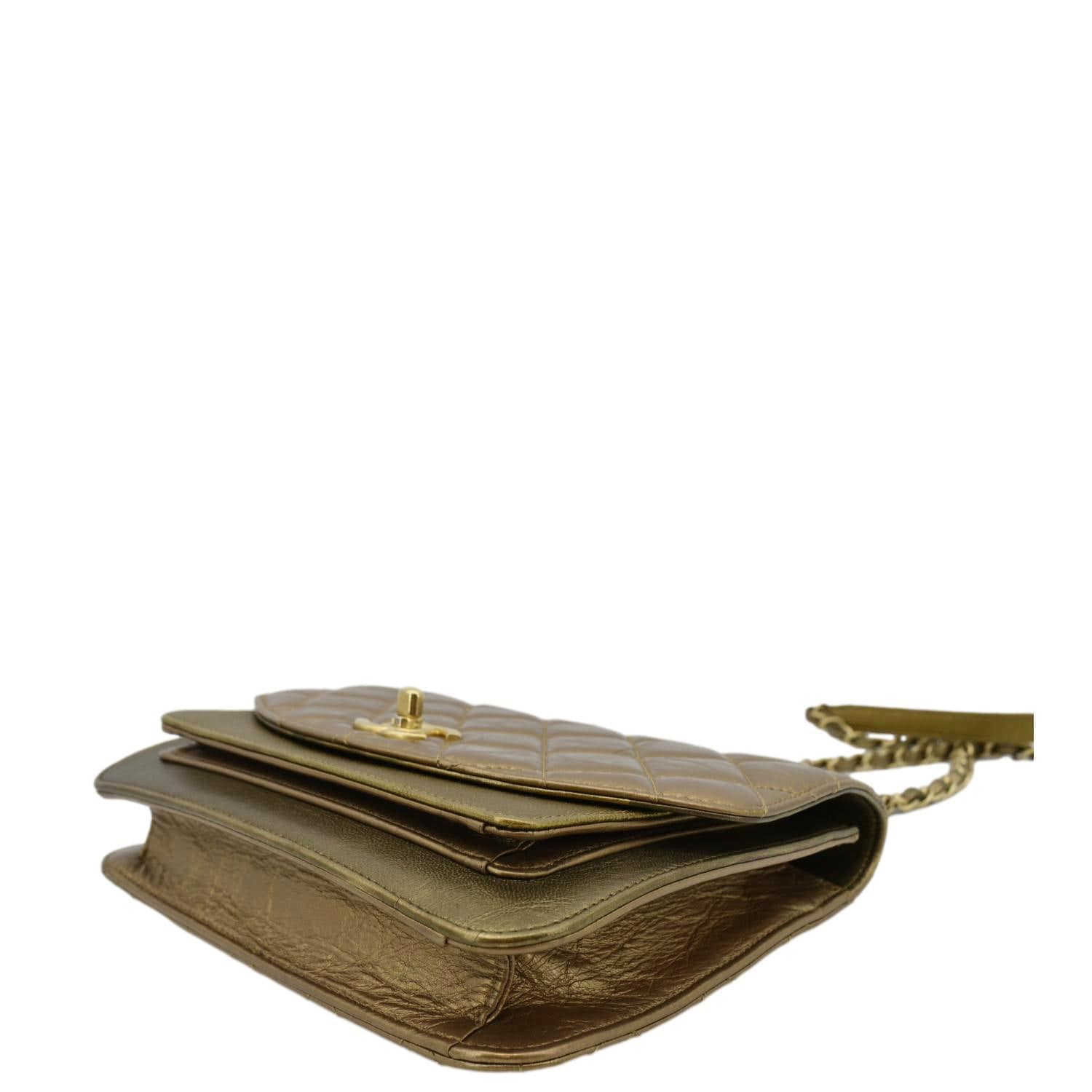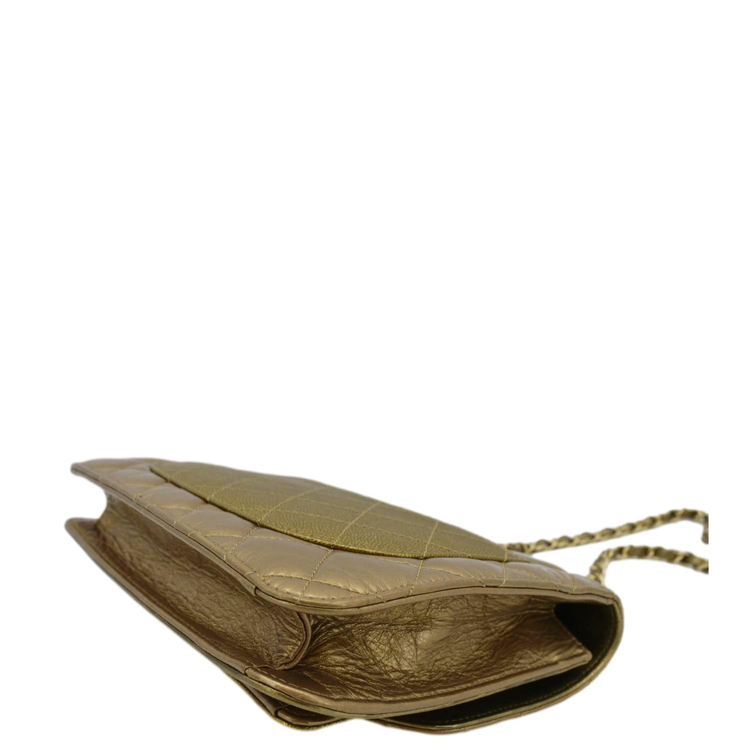 The CHANEL Chain Handle Flap Crossbody Bag in Quilted Metallic Calfskin Caviar Chrome features a striking metallic finish, signature quilted design, and a sophisticated chain handle, making it a luxurious and stylish accessory for any occasion.