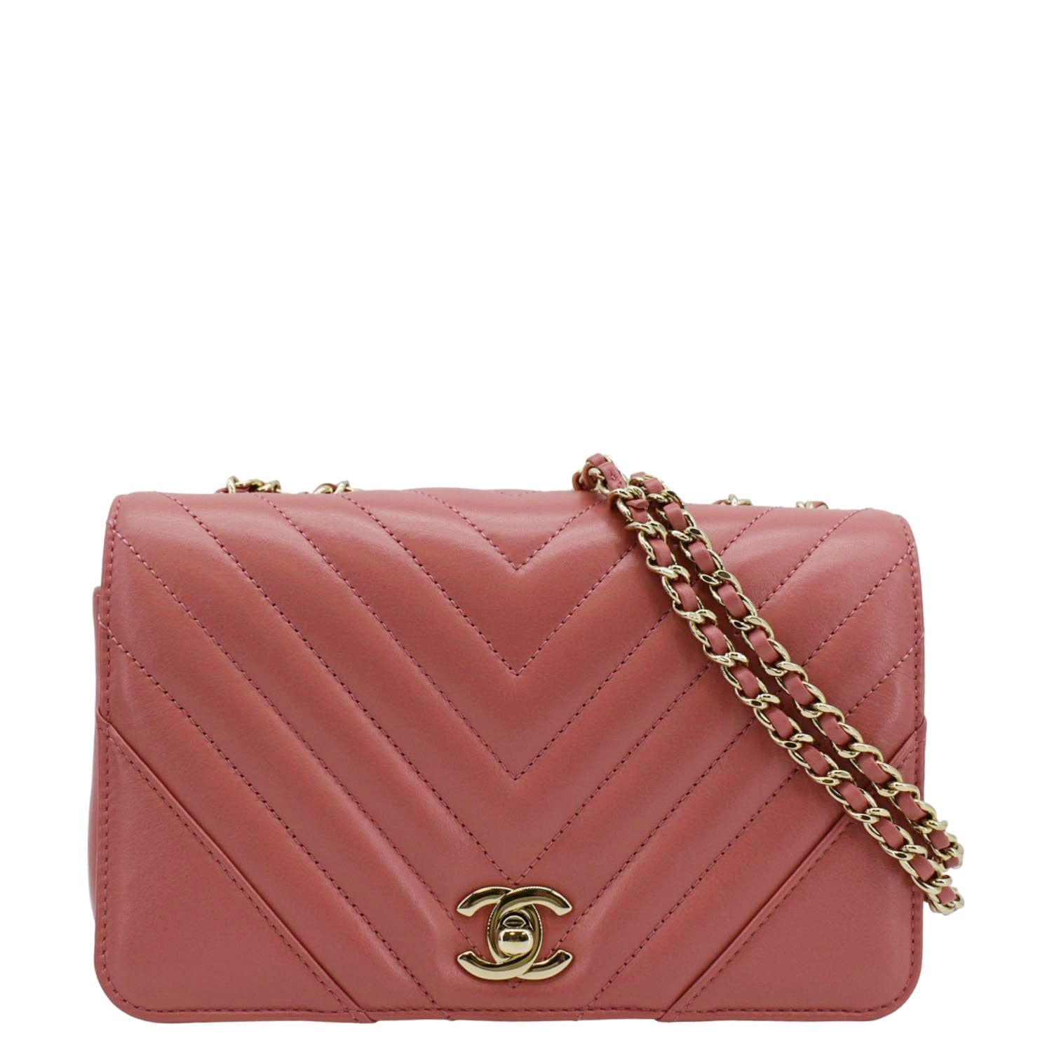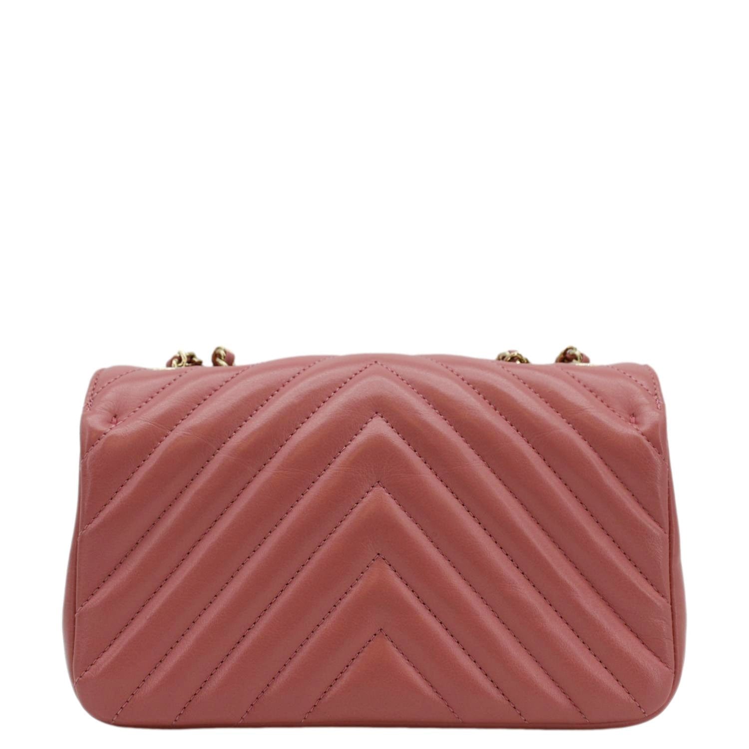 The CHANEL Statement Flap Mini Quilted Chevron Crossbody Bag in Pink is a chic and stylish accessory. It features a chevron-quilted pattern, a compact design, and the iconic interlocking CC logo, making it perfect for both day and evening wear.