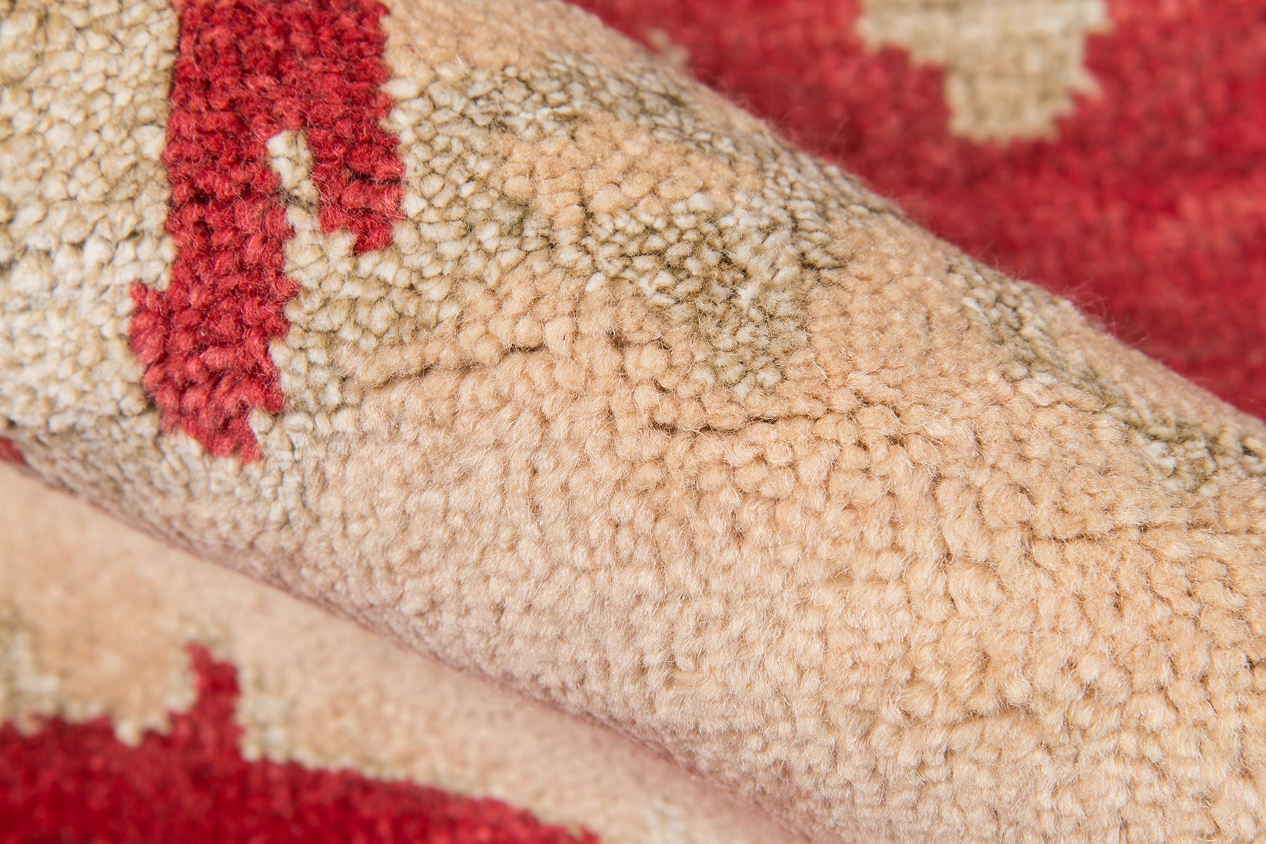 Heaven and earth collide in the abstract design of this modern area rug. The brilliant red shade of the contemporary floorcovering makes an instant impression on interior floors, its fiery tones tempered by beige striations and splashes of sky blue. The hand-knotted rug is crafted with care from a blend of wool and viscose fibers, each individual loop displaying exceptional depth of color and durability underfoot.