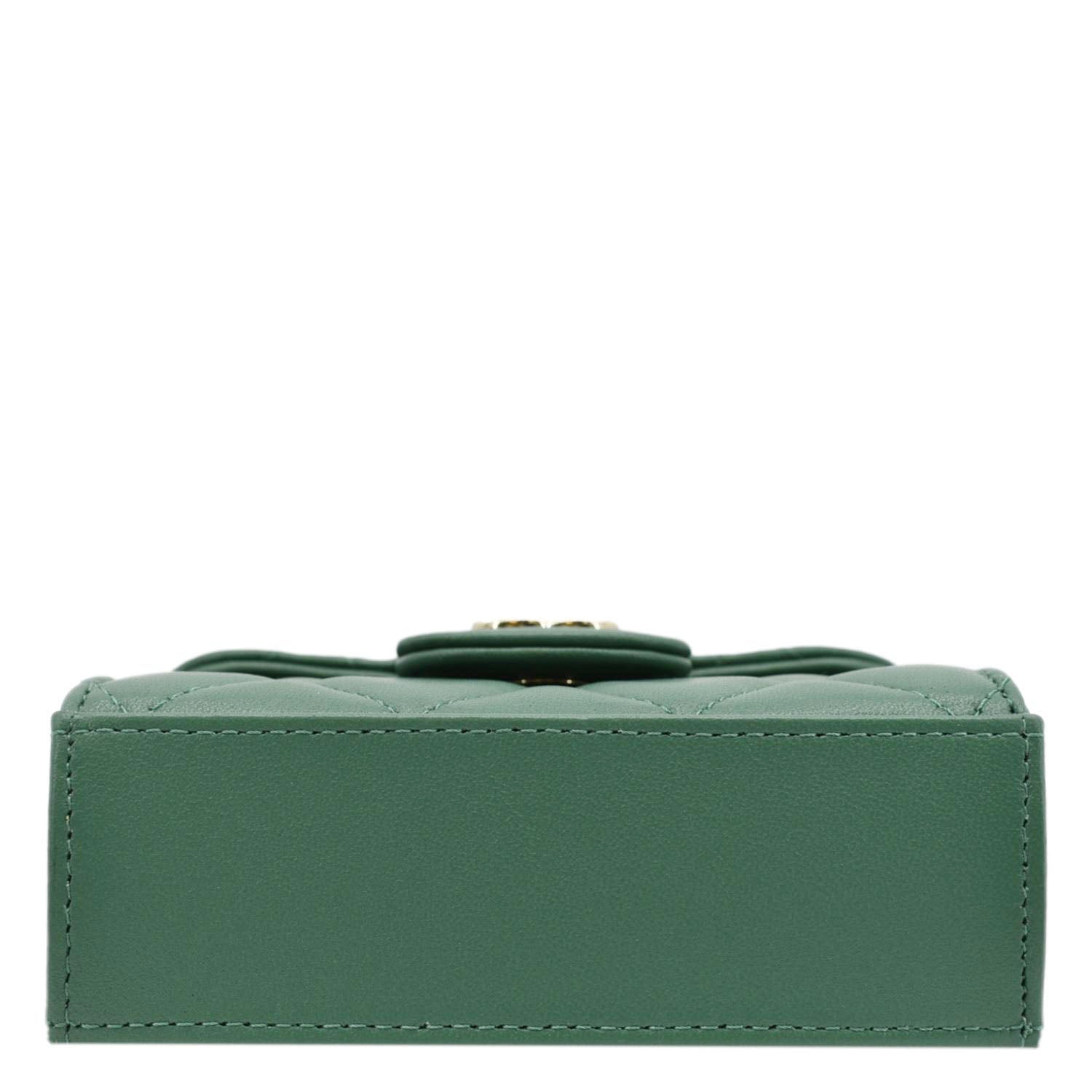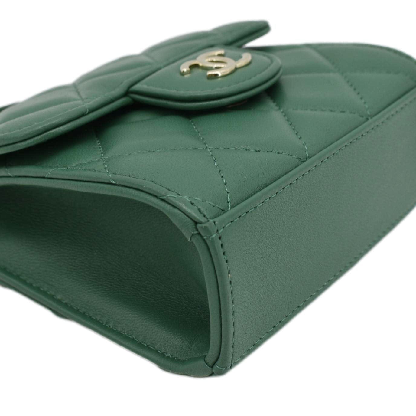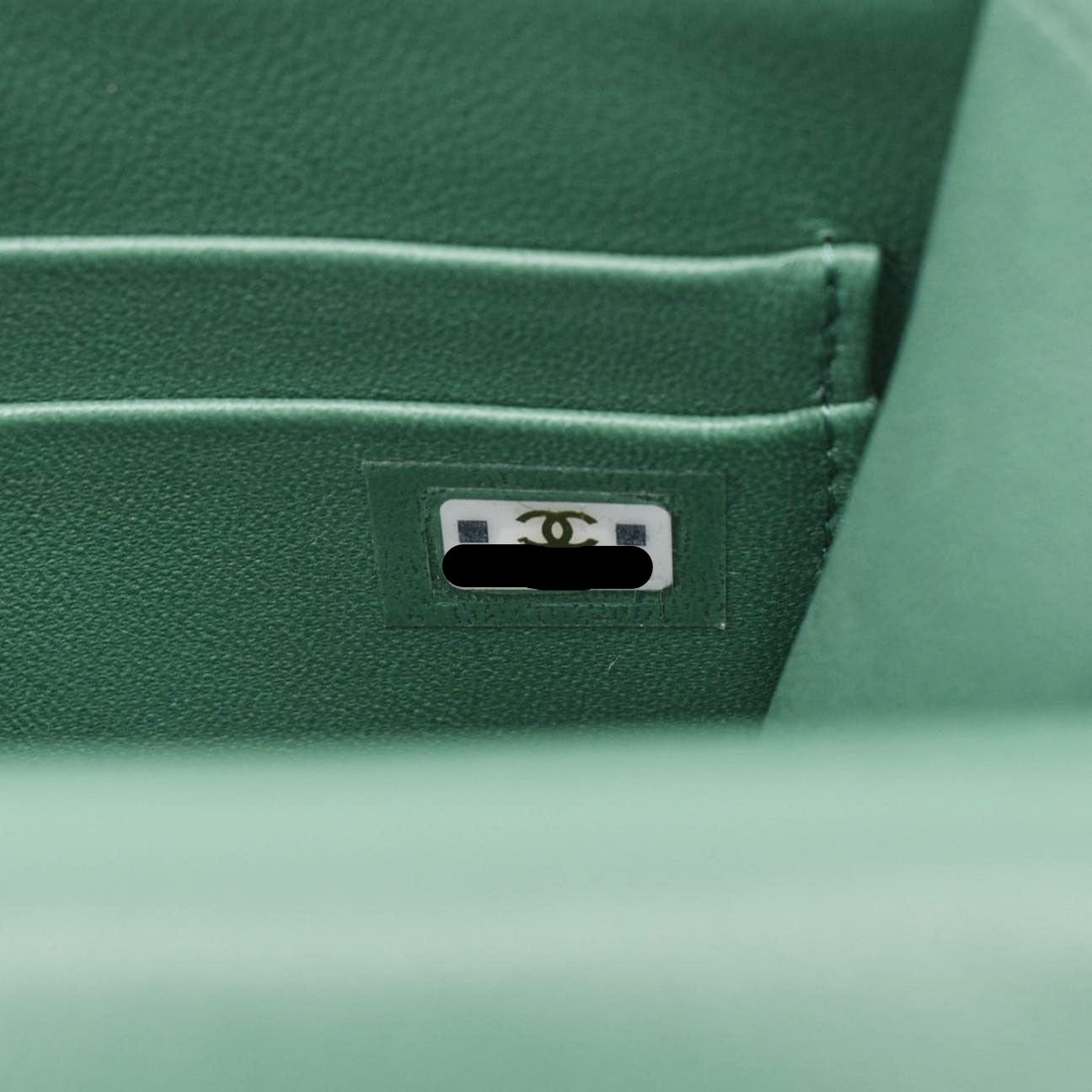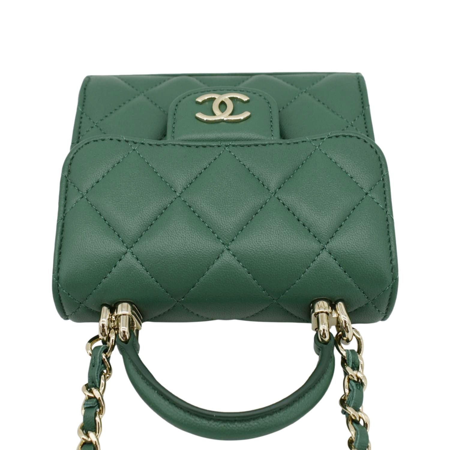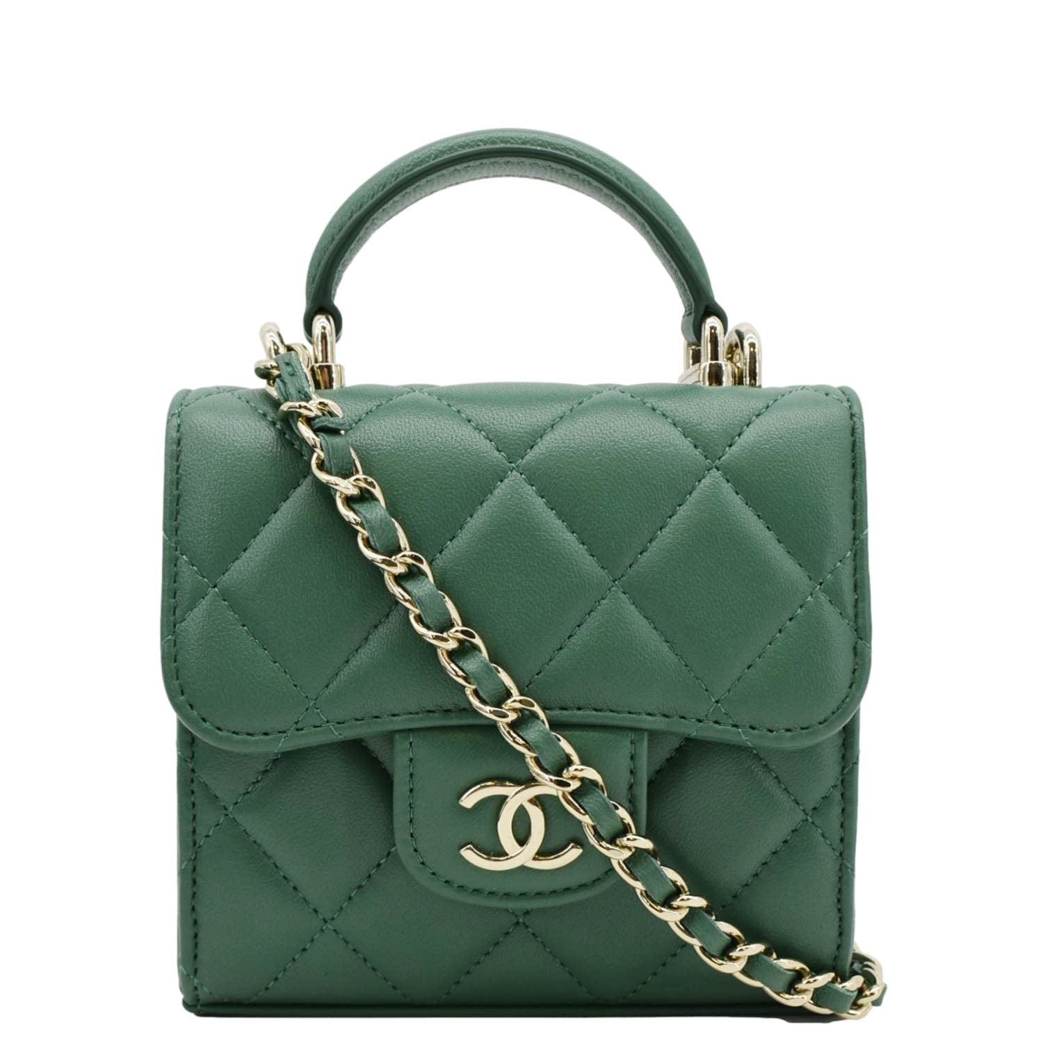 Chic and compact, the CHANEL Mini Top Handle Leather Crossbody Clutch Bag in Green exudes timeless elegance with its iconic design and versatile functionality.