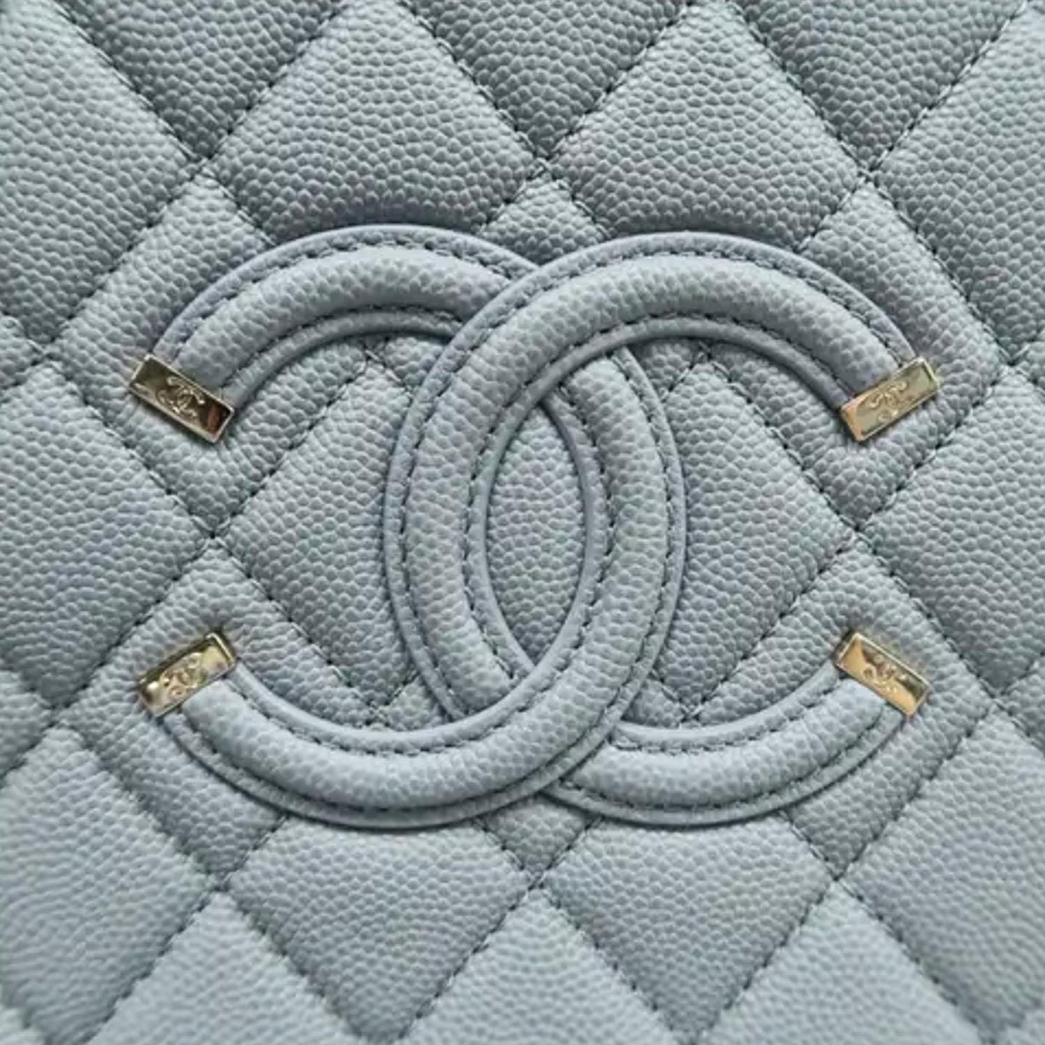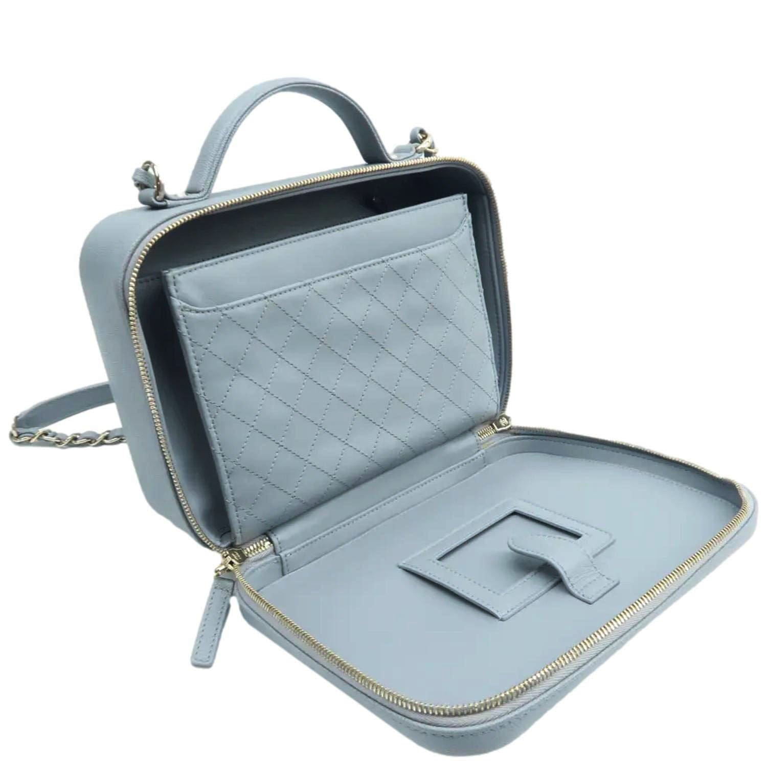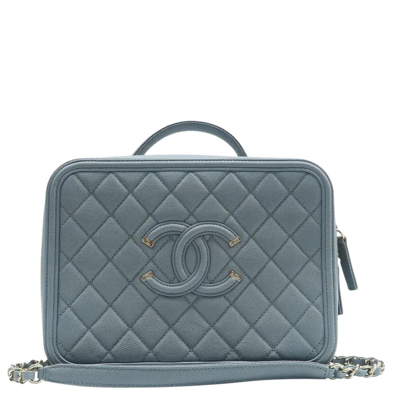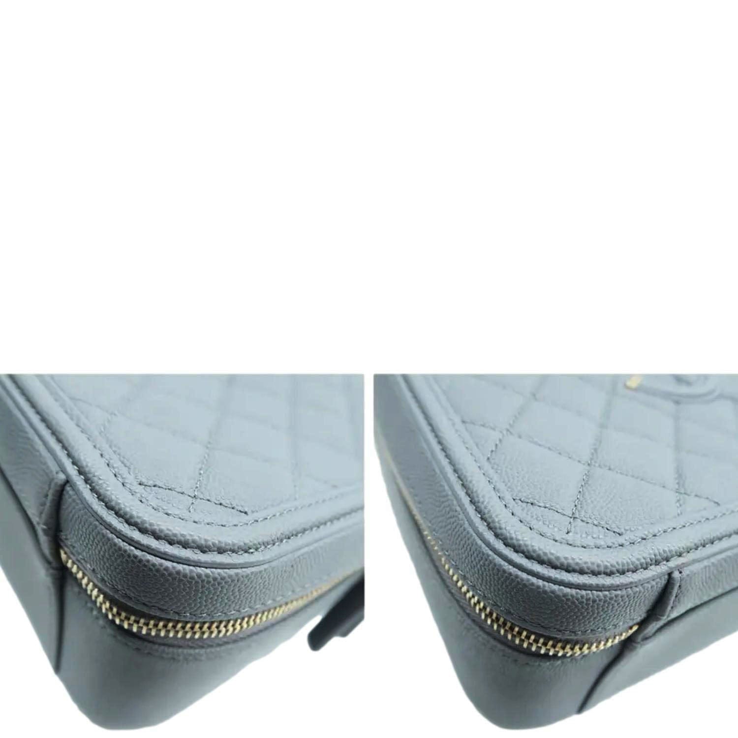 The Chanel Vanity Case Filigree CC Medium Caviar Quilted Shoulder Bag in Grey features luxurious caviar leather, elegant quilting, and the iconic Filigree CC logo. This chic medium-sized bag offers a stylish vanity case design with a convenient shoulder strap, blending sophistication and practicality in a versatile grey hue.