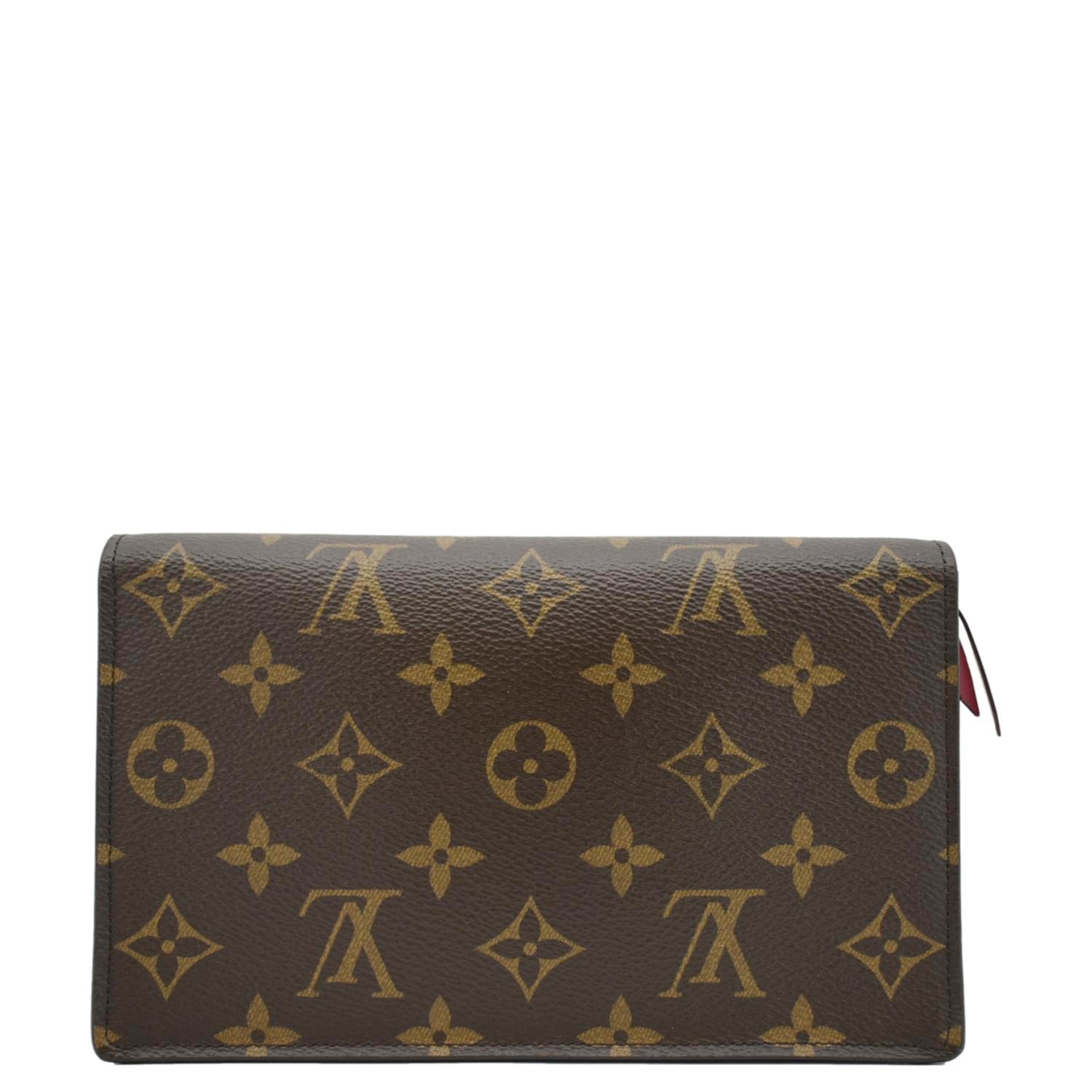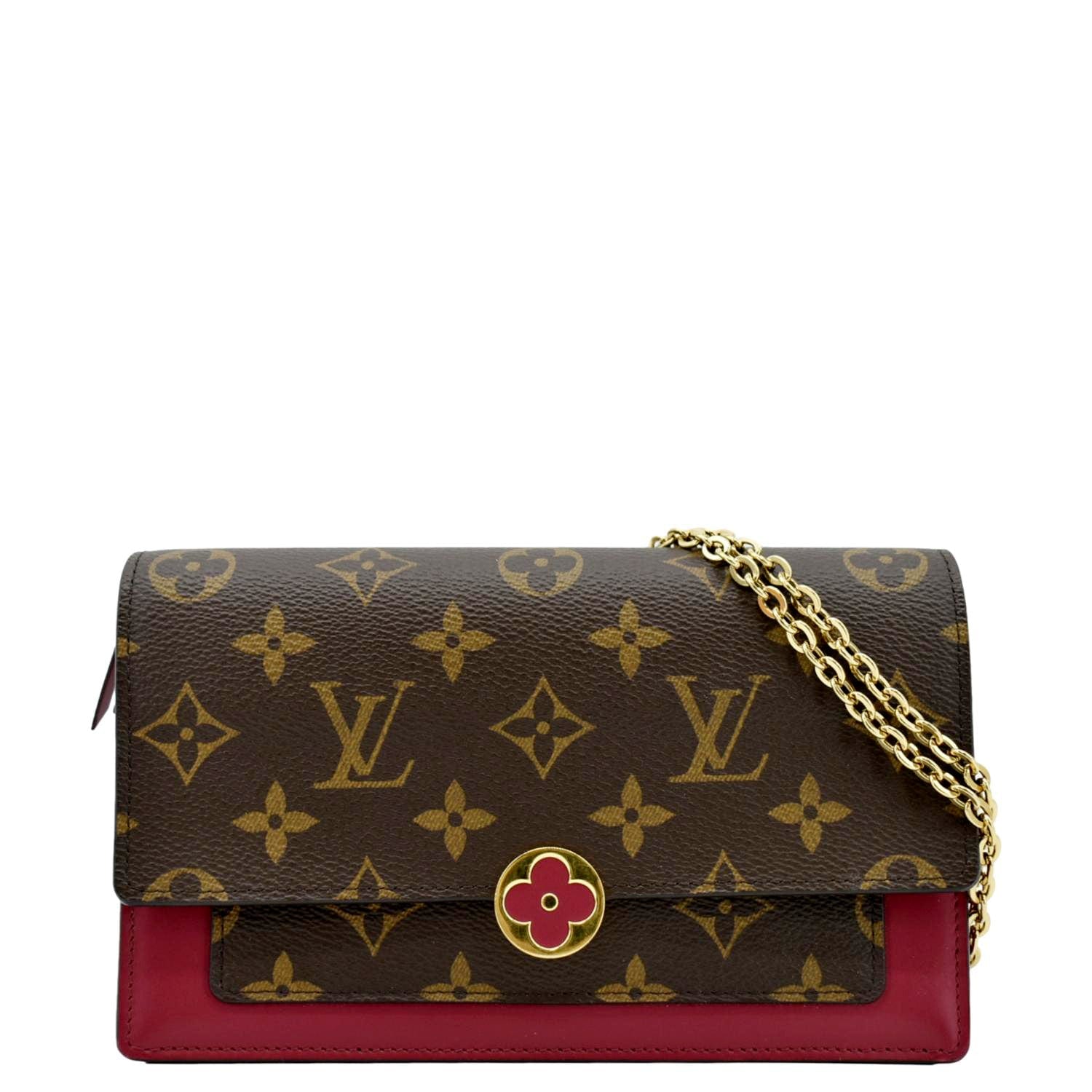 The LOUIS VUITTON Flore Monogram Canvas Chain Wallet in Fuchsia features an iconic monogram canvas with a vibrant fuchsia leather accent. This chic wallet includes a gold-tone chain, making it versatile for use as a clutch or shoulder bag.