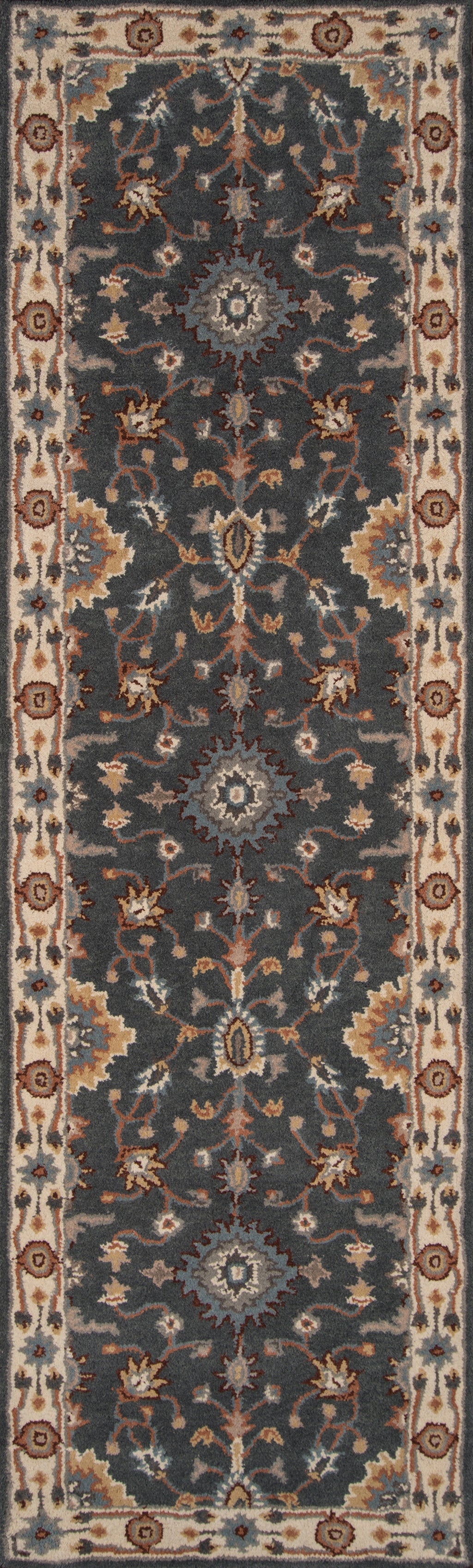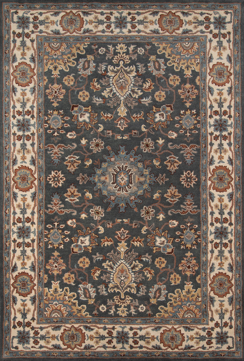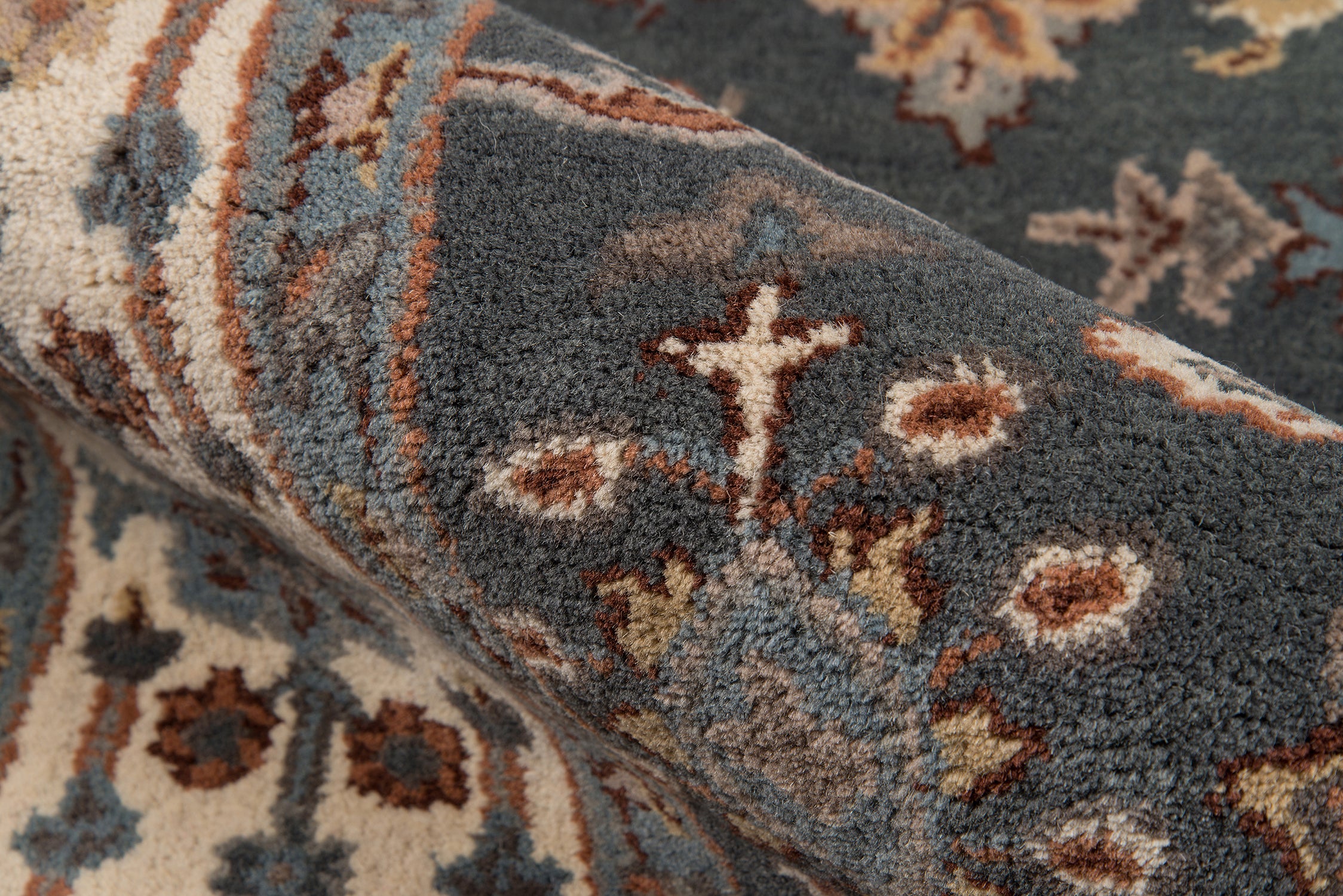 An exquisite arrangement of botanical figures adorns this indoor area rug with a decorative motifs that are tried and true. The ornate rug field and border draws from timeless design themes, as grey, blue and yellow shades reflect the pomegranate, flower petal and vine patterning of antique Persian carpets. Hand tufted from natural wool fibers, the ornamental rug field is filled with classical elements that capture the essence of traditional style.