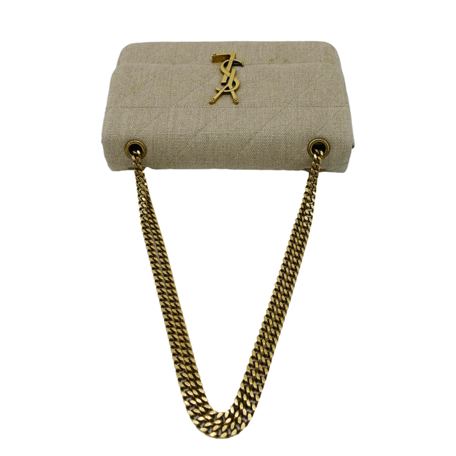 The YVES SAINT LAURENT Patchwork Jamie Jersey Wool Shoulder Bag in Beige showcases a unique patchwork design. This chic shoulder bag offers a blend of luxury and casual style, making it a versatile addition to any wardrobe.