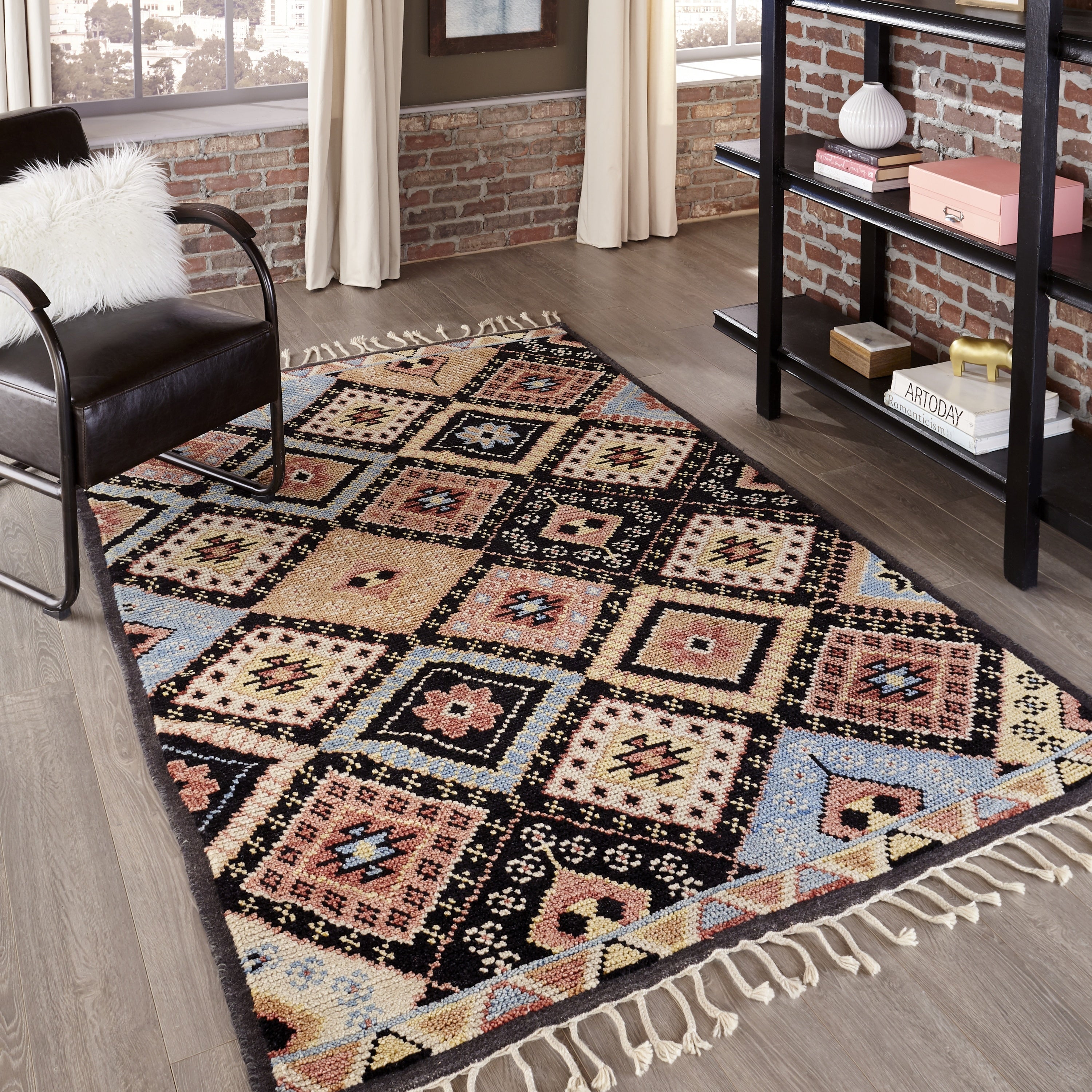 The tribal design of the Nomad captures the essence of boho chic. Inspired by ancestral area rug motifs, traditional diamond and dot symbols fill the ornamental field and decorative border with a repeating geometric pattern in a vivid color palette. Each rug is embellished with tassels of fringe that enhance the assortment’s global elements. Hand knotted from 100% natural wool fibers, the free-spirited style looks luxe when placed as a featured floorcovering at the center of the room or layered in a casual arrangement beneath coffee tables and chairs.