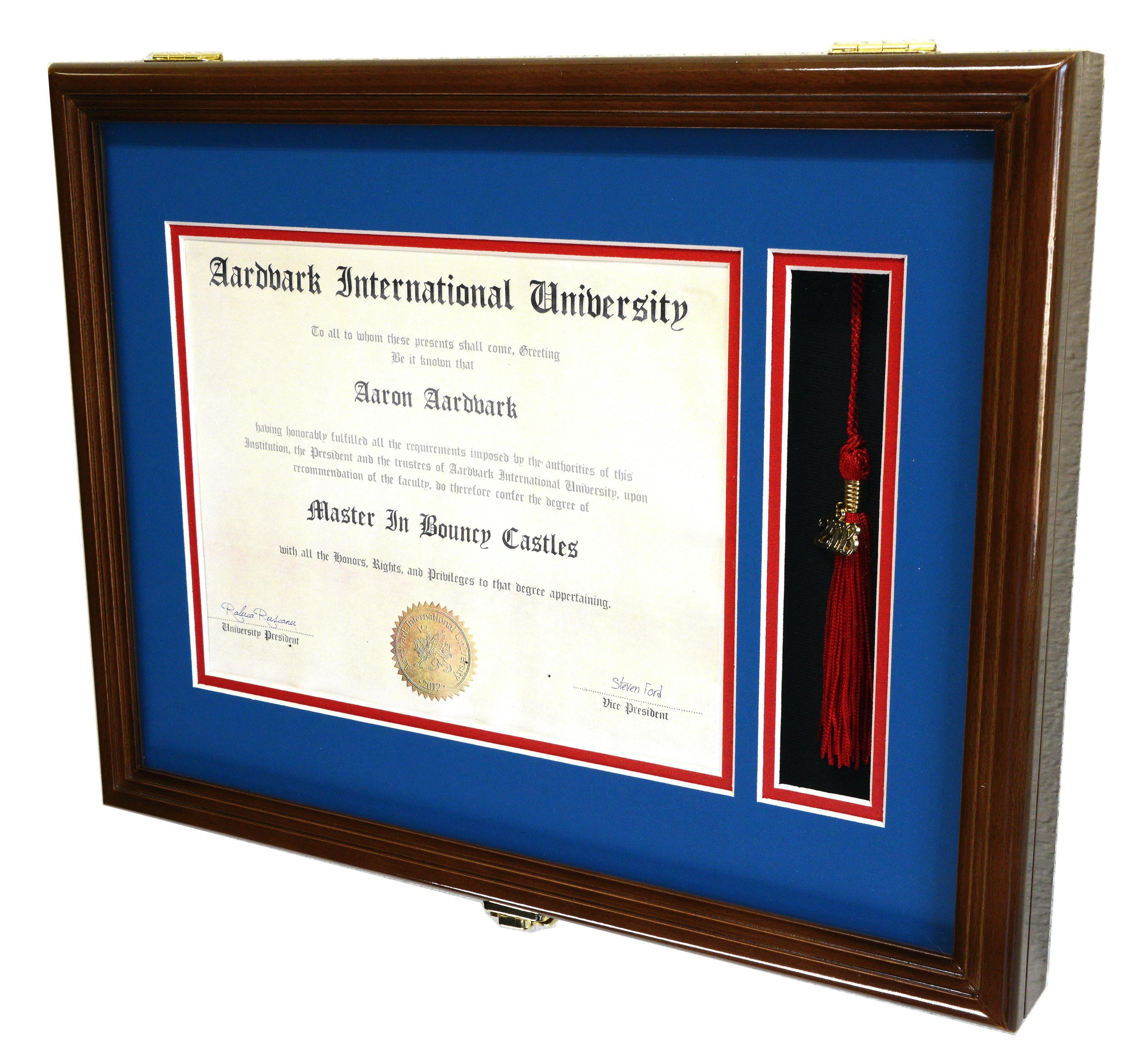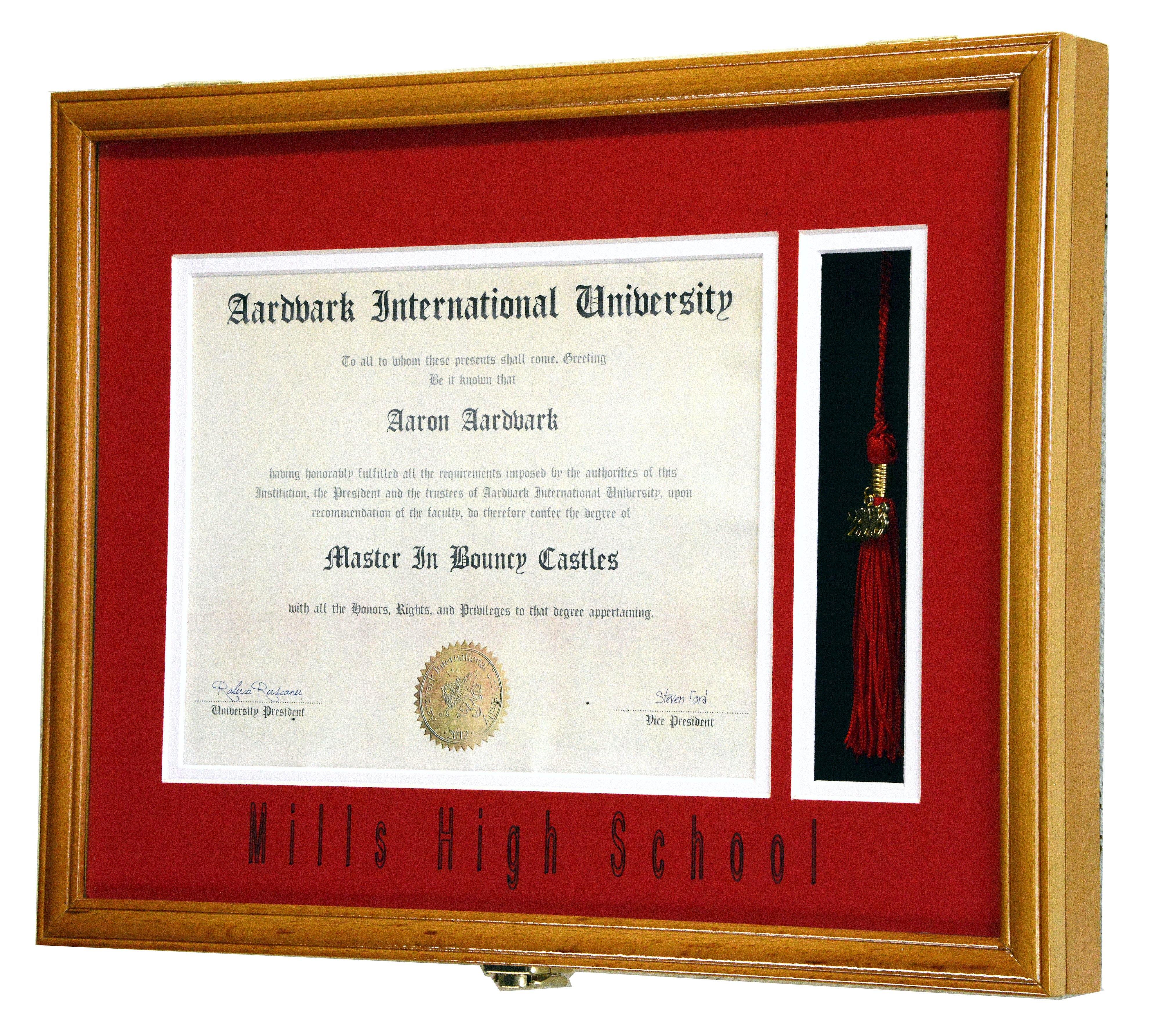This diploma display case includes a matting layout that shows 1 diploma and tassle, custom cut with your matting color choice to match the school colors. Perfect for any high school, college, or university graduate to elegantly display their diploma, certificate, or award.