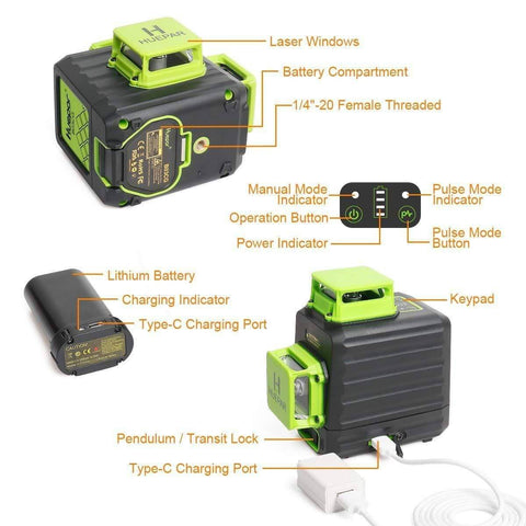 CONVENIENT TYPE-C CHARGING & DURABLE DESIGN: With TYPE-C charging function, this laser tool can be used at job site with direct input charging even if take out the battery. Super large capacity rechargeable lithium battery can last for 6 hours with all lasers on. The overall TPR soft rubber housing as well as compact design makes the laser tool more durable and portable.