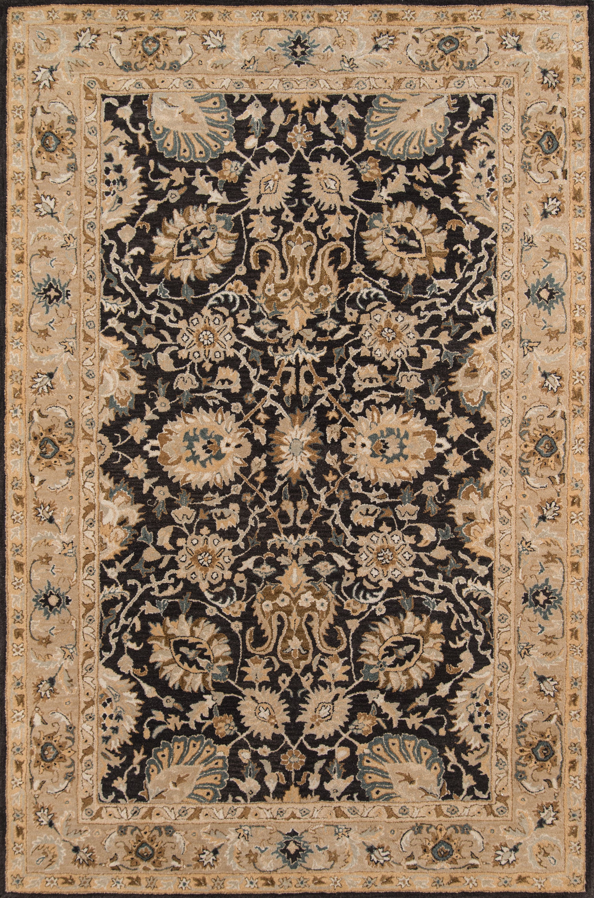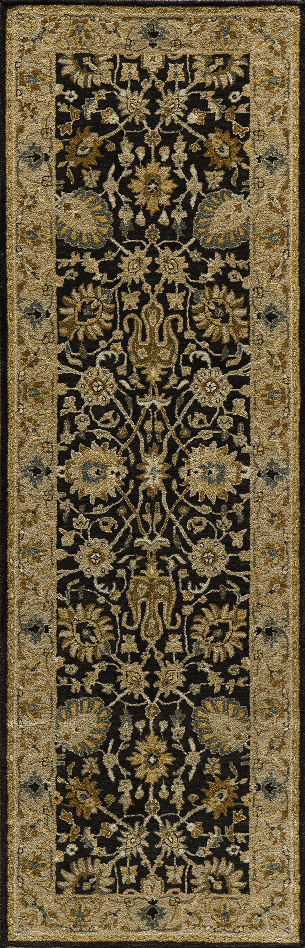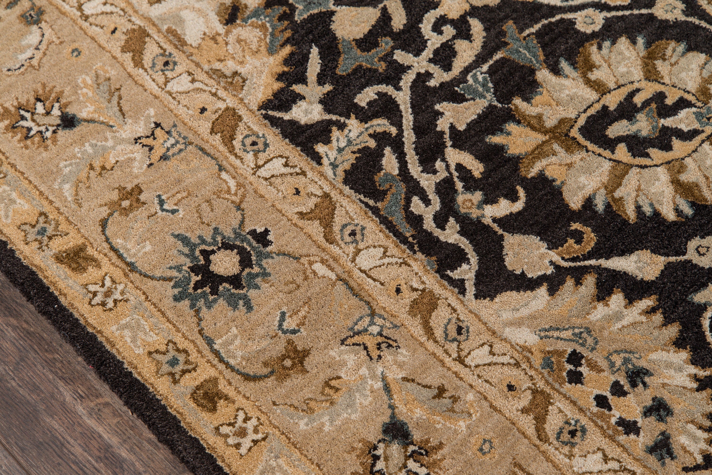 The opulent design of this traditional area rug reveals the world-renown characteristics of classic Tabriz floorcoverings. Historical references are reflected in the black field and golden beige border that displays an ornamental array of flowers, vines and serrated leaf motifs. A sumptuous combination of natural wool fibers provides a comfortable cushion for tired feet and a plush texture that reflects the craftsmanship perfected by master weavers.