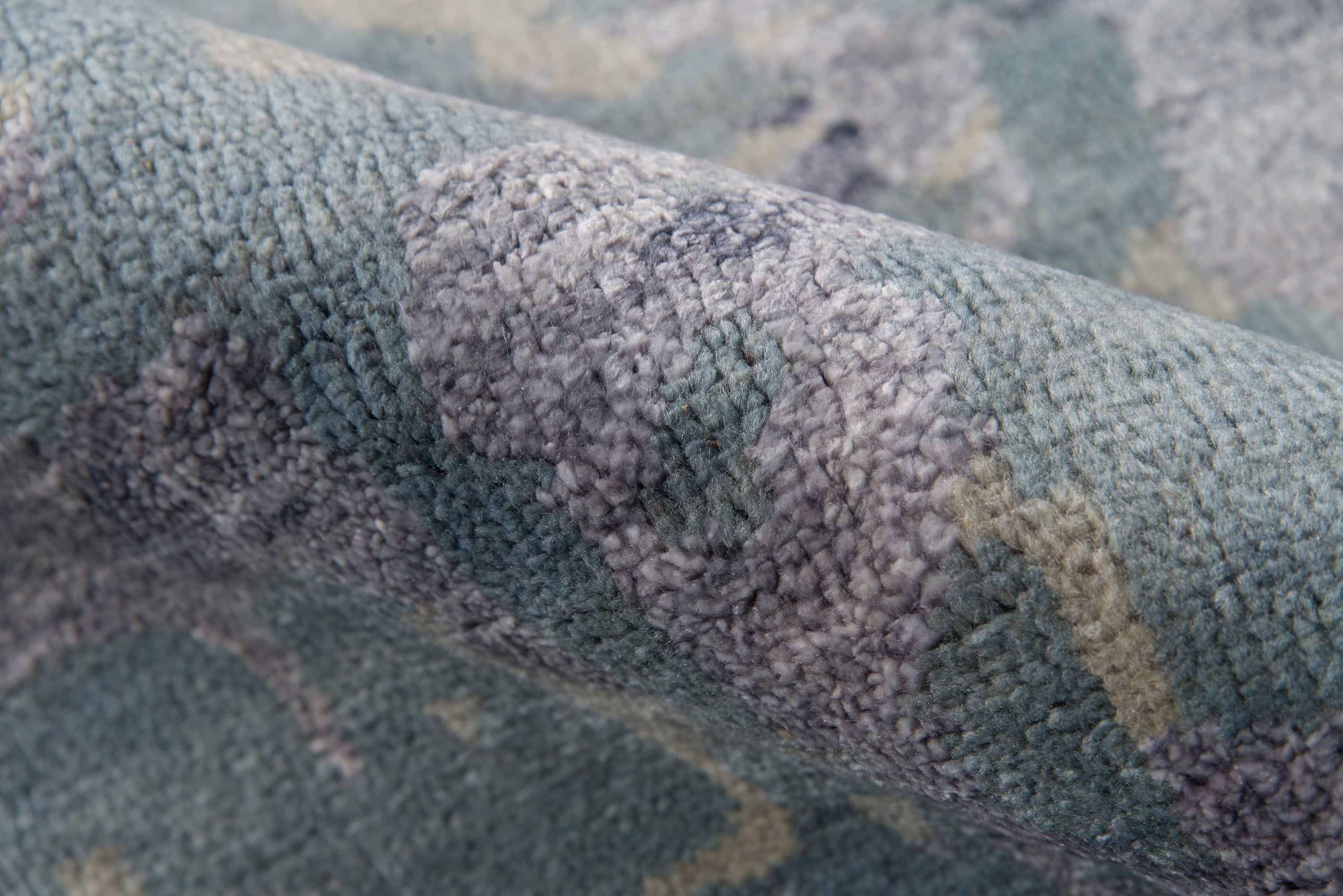 The marine-inspired palette of this modern area rug presents an interpretive perspective in underwater colors. The abstract rug pattern unfurls in aquatic blue tones and textures, each royal blue, turquoise and periwinkle shade defined by the depths of the ocean. The hand-knotted rug is crafted with care from a blend of wool and viscose fibers, each individual loop displaying exceptional depth of color and durability underfoot.