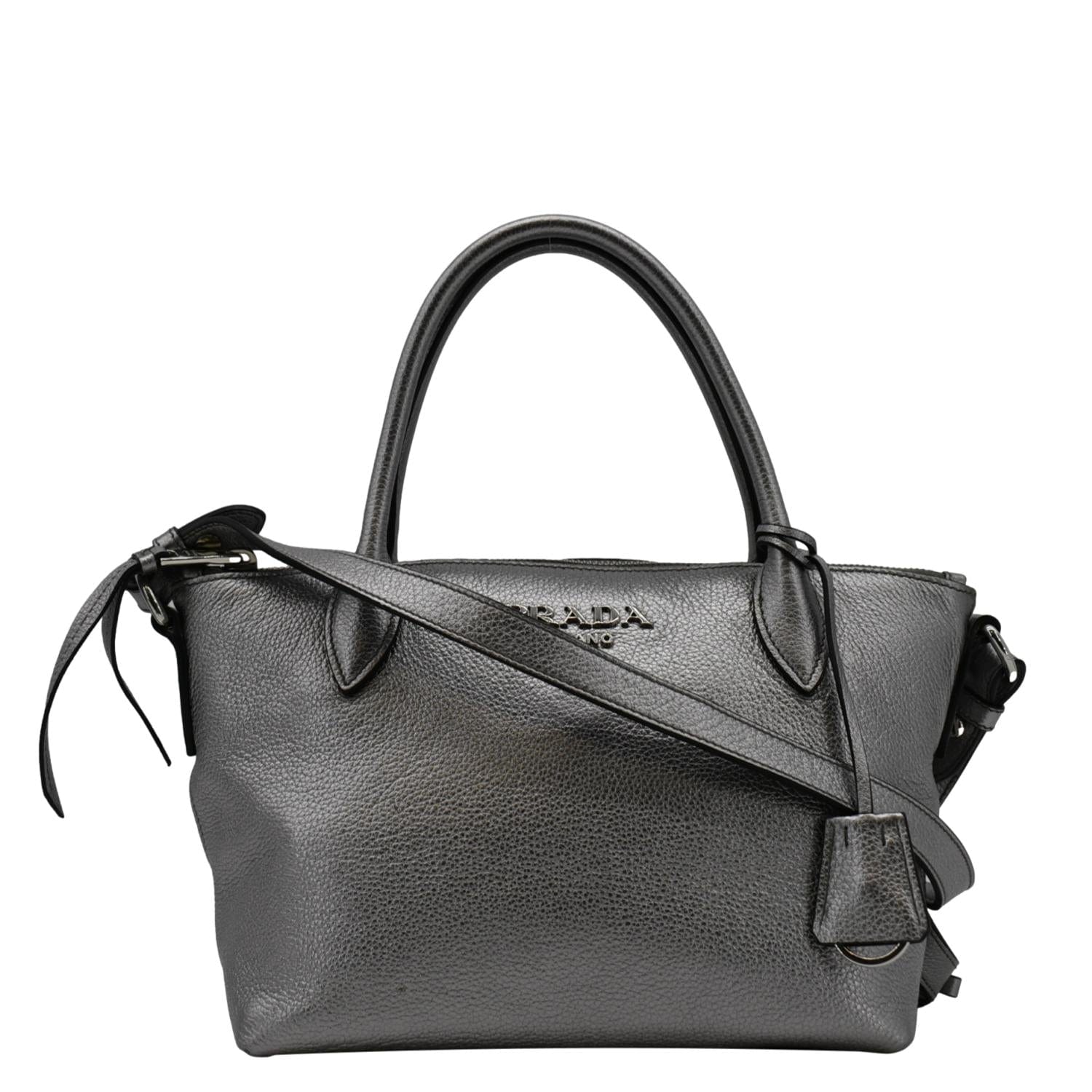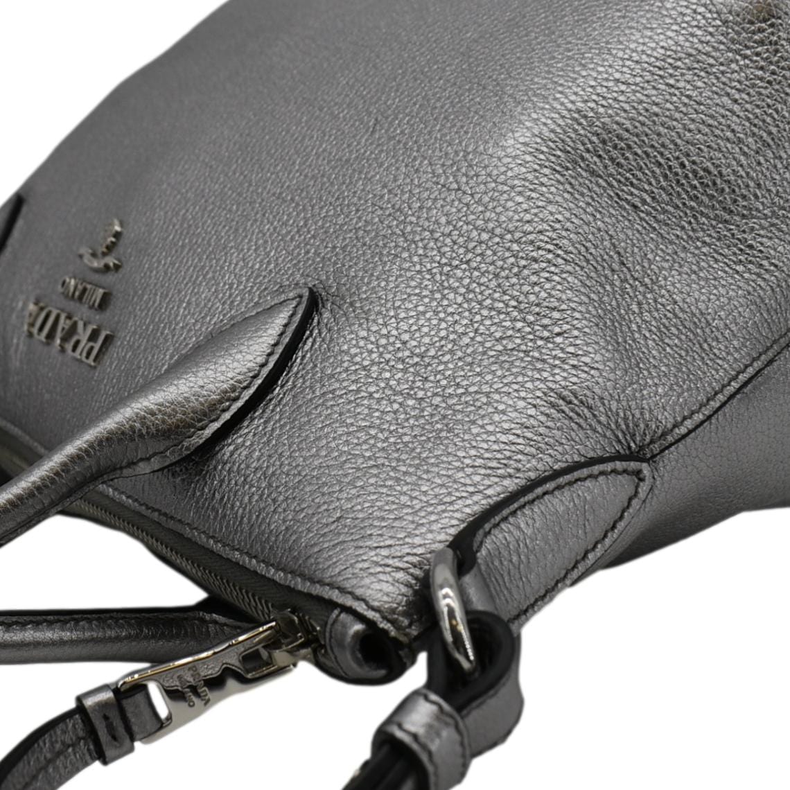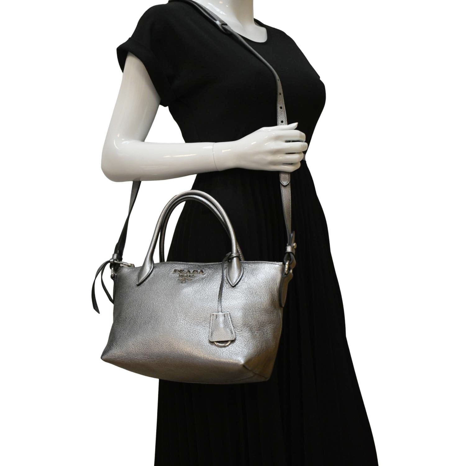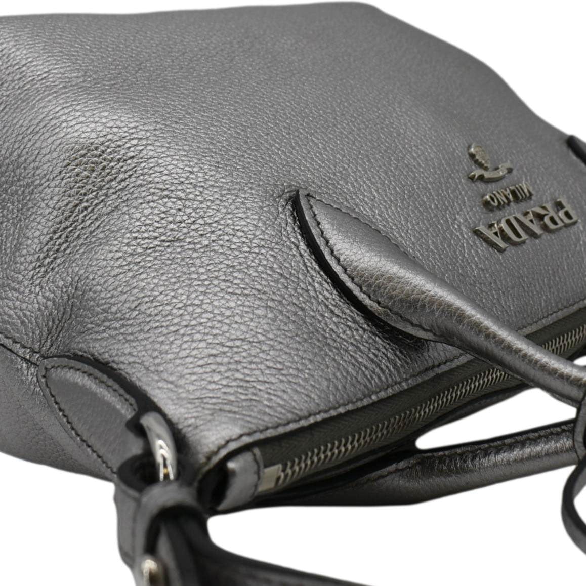 The PRADA Vitello Daino Leather Tote Shoulder Bag in Silver showcases luxurious leather with a spacious interior. It features dual handles, a detachable shoulder strap, and multiple pockets for organized storage.
