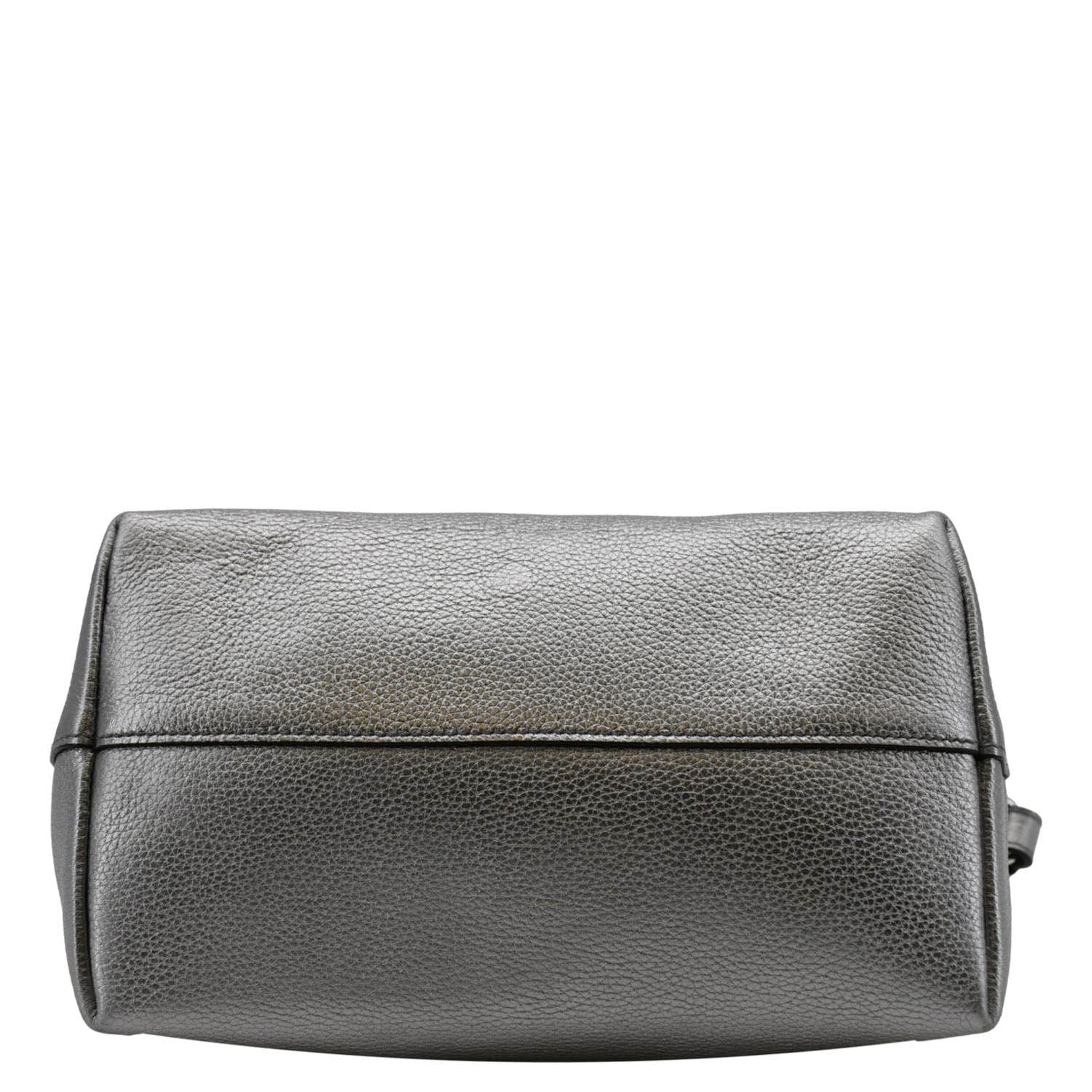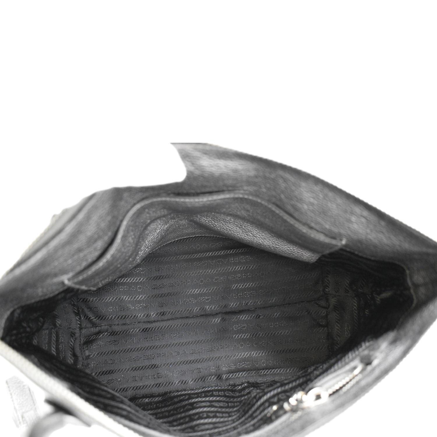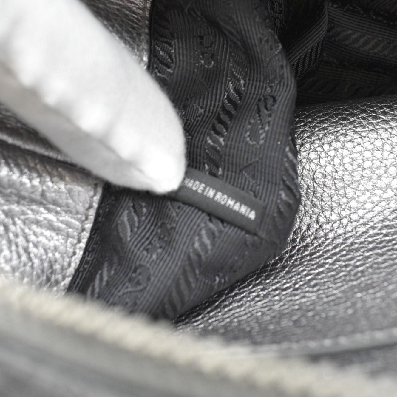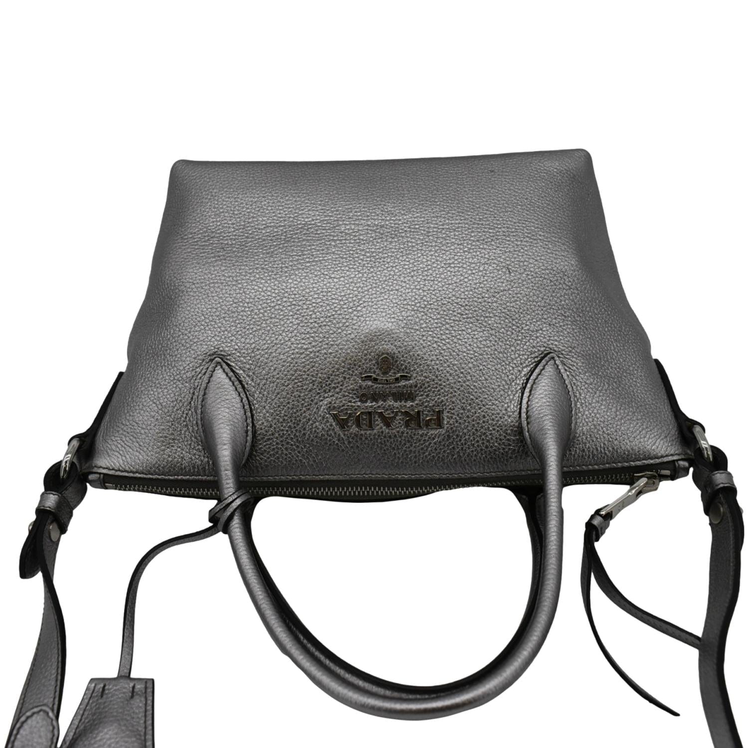 The PRADA Vitello Daino Leather Tote Shoulder Bag in Silver showcases luxurious leather with a spacious interior. It features dual handles, a detachable shoulder strap, and multiple pockets for organized storage.