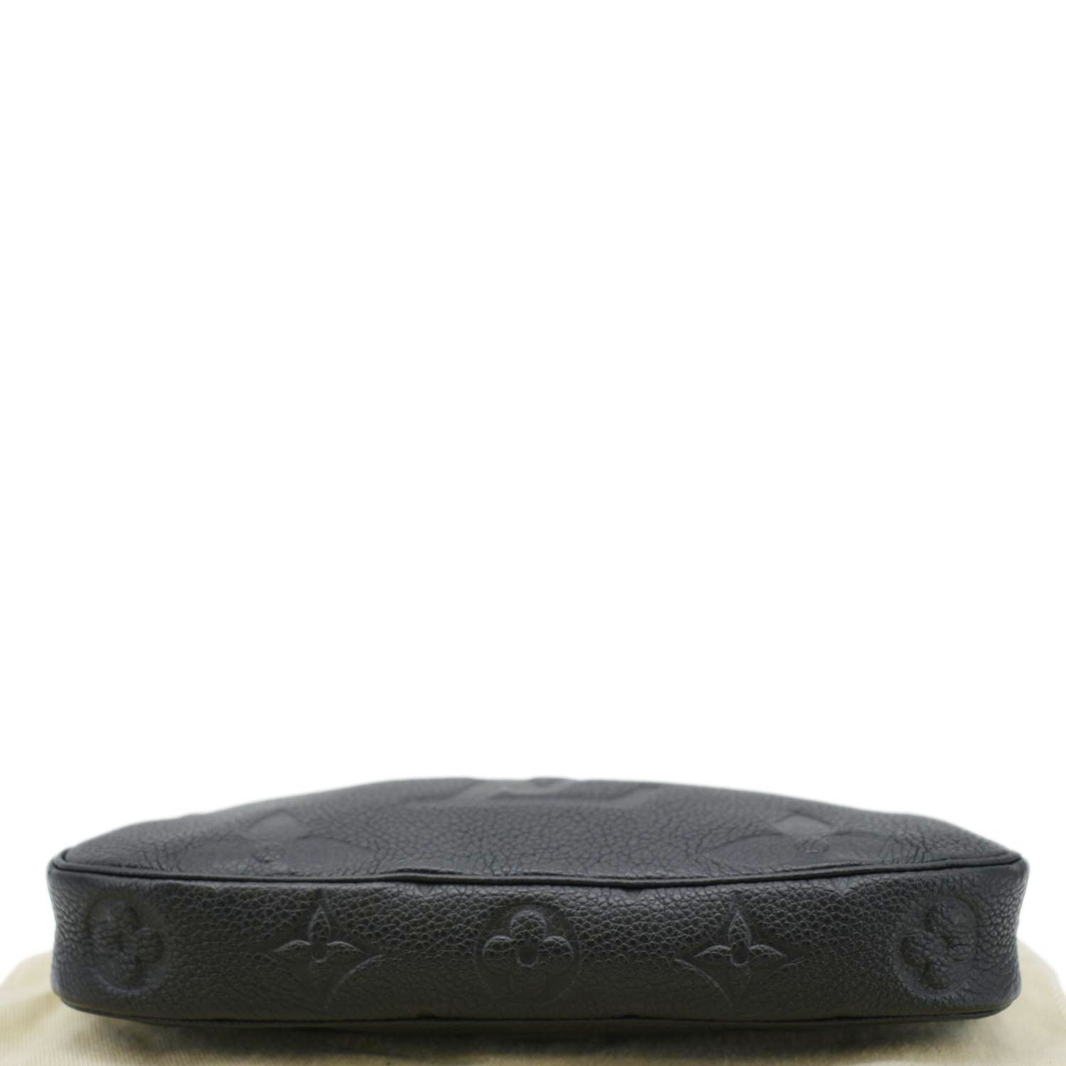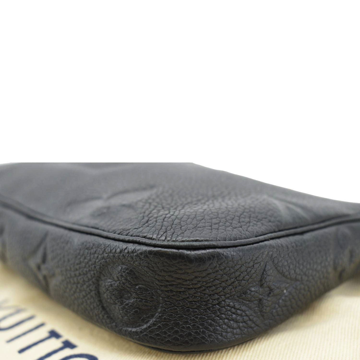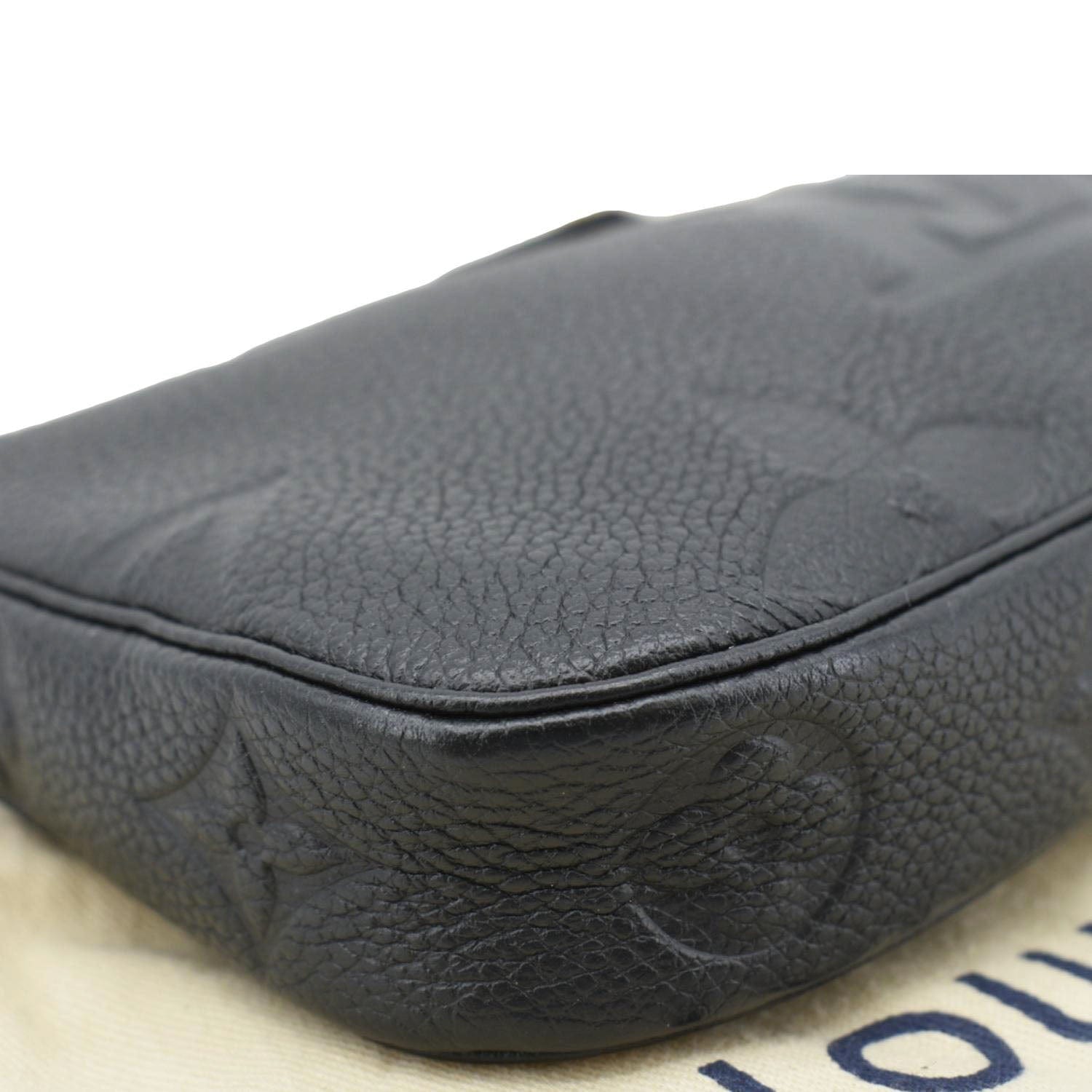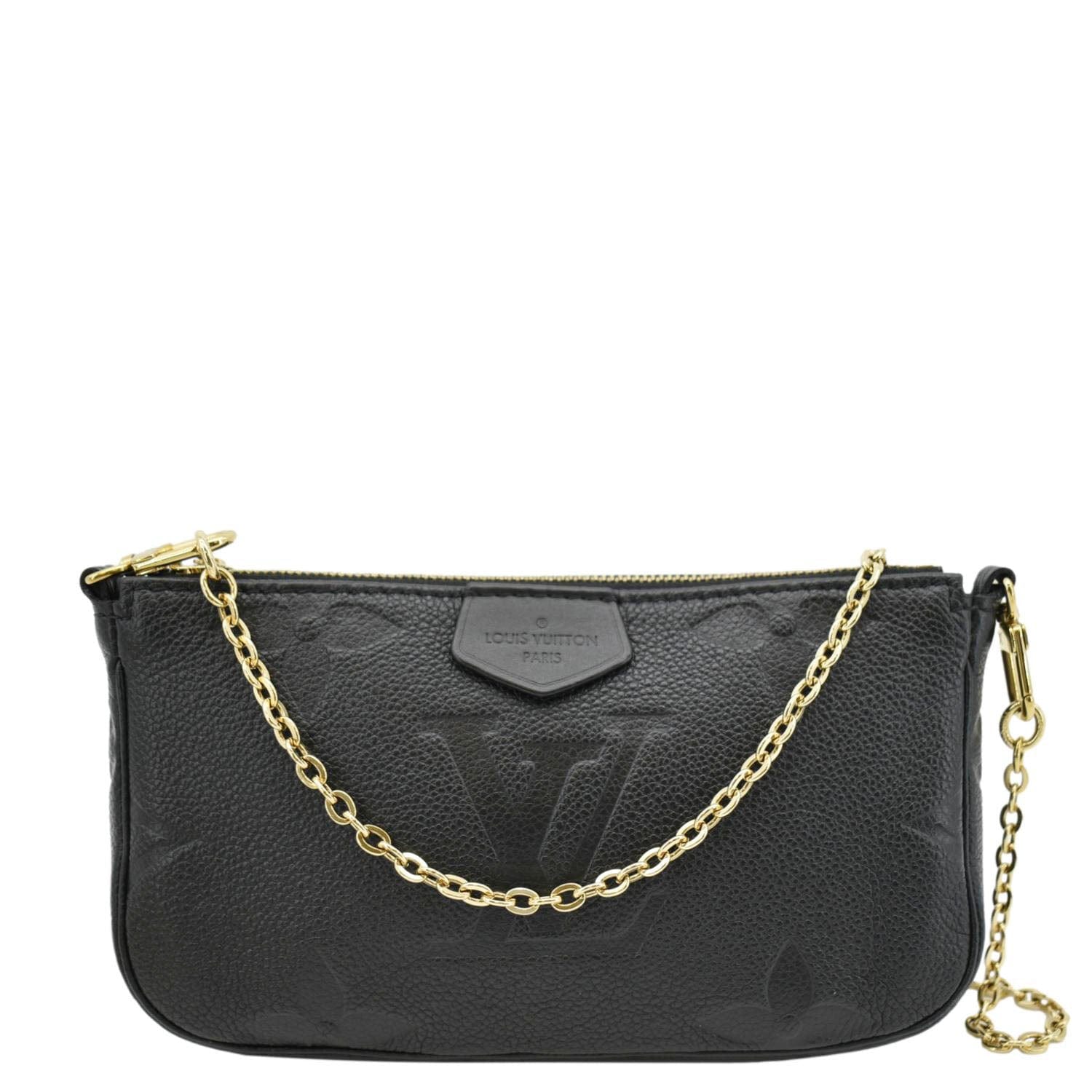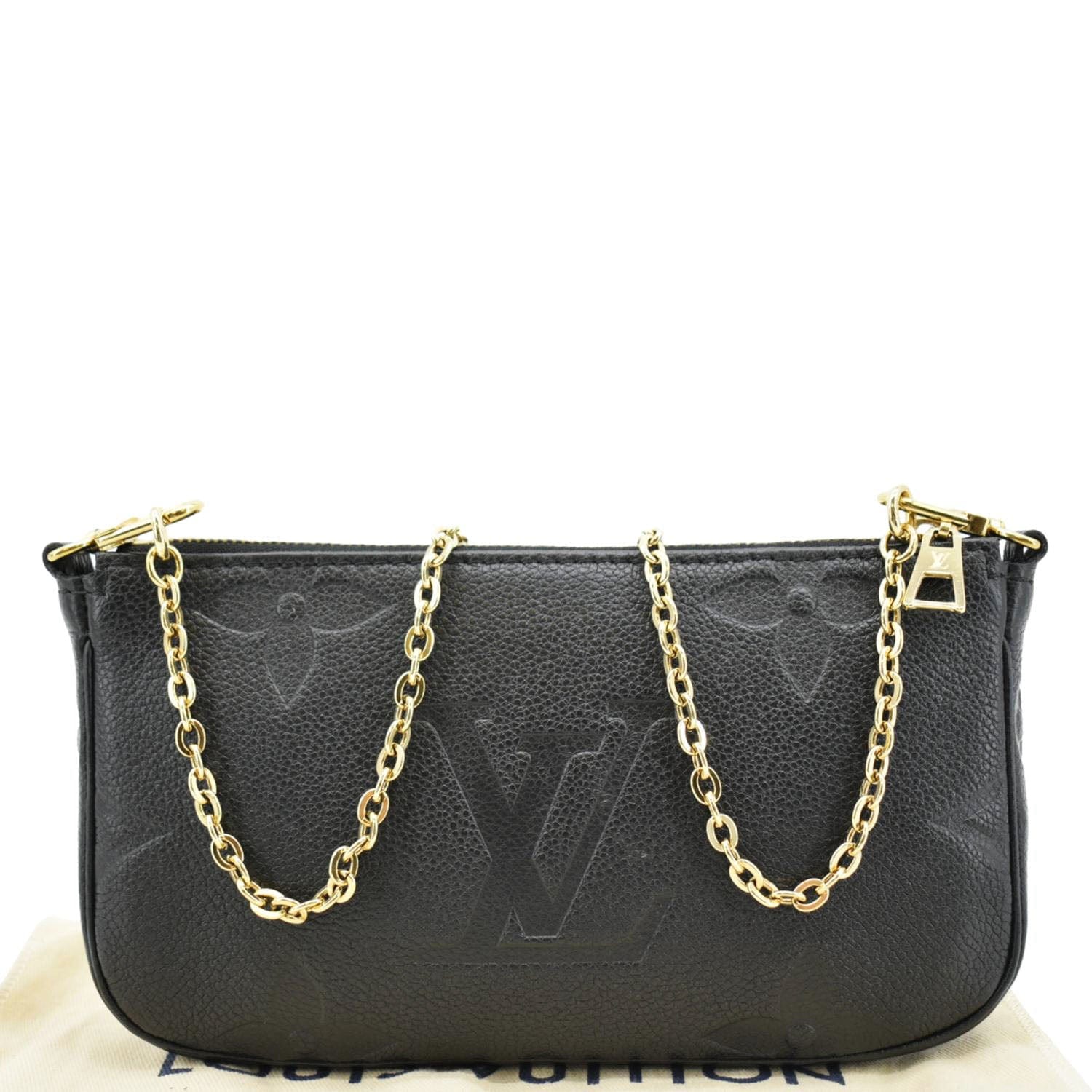 The Louis Vuitton Pochette Accessoires Monogram Empreinte Shoulder Bag in Black features luxurious monogram-embossed leather with a sleek, versatile design. Perfect for day-to-night use, it comes with a gold-tone chain strap, adding a touch of elegance to any outfit.