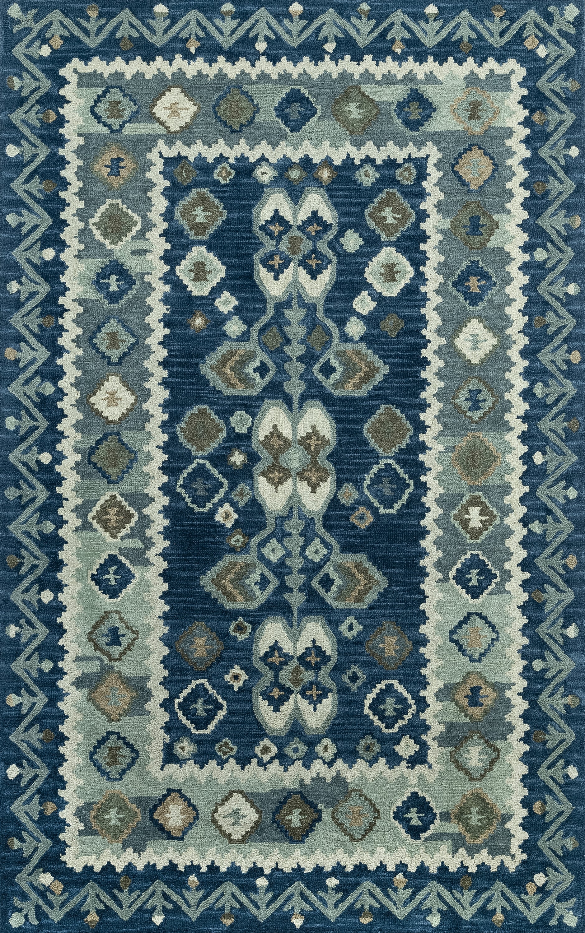 Inspired by traditional Kazak patterns and their lively textiles, this blue patterned rug feels completely unique. With geometric shapes coinciding with rugged lines, it's sure to be a statement piece in your home whether it’s placed in a home office or right in the middle of your open concept floor plan. hand-hooked with 100% wool, it’s forgiving to everyday mishaps and spills and soft to the touch.