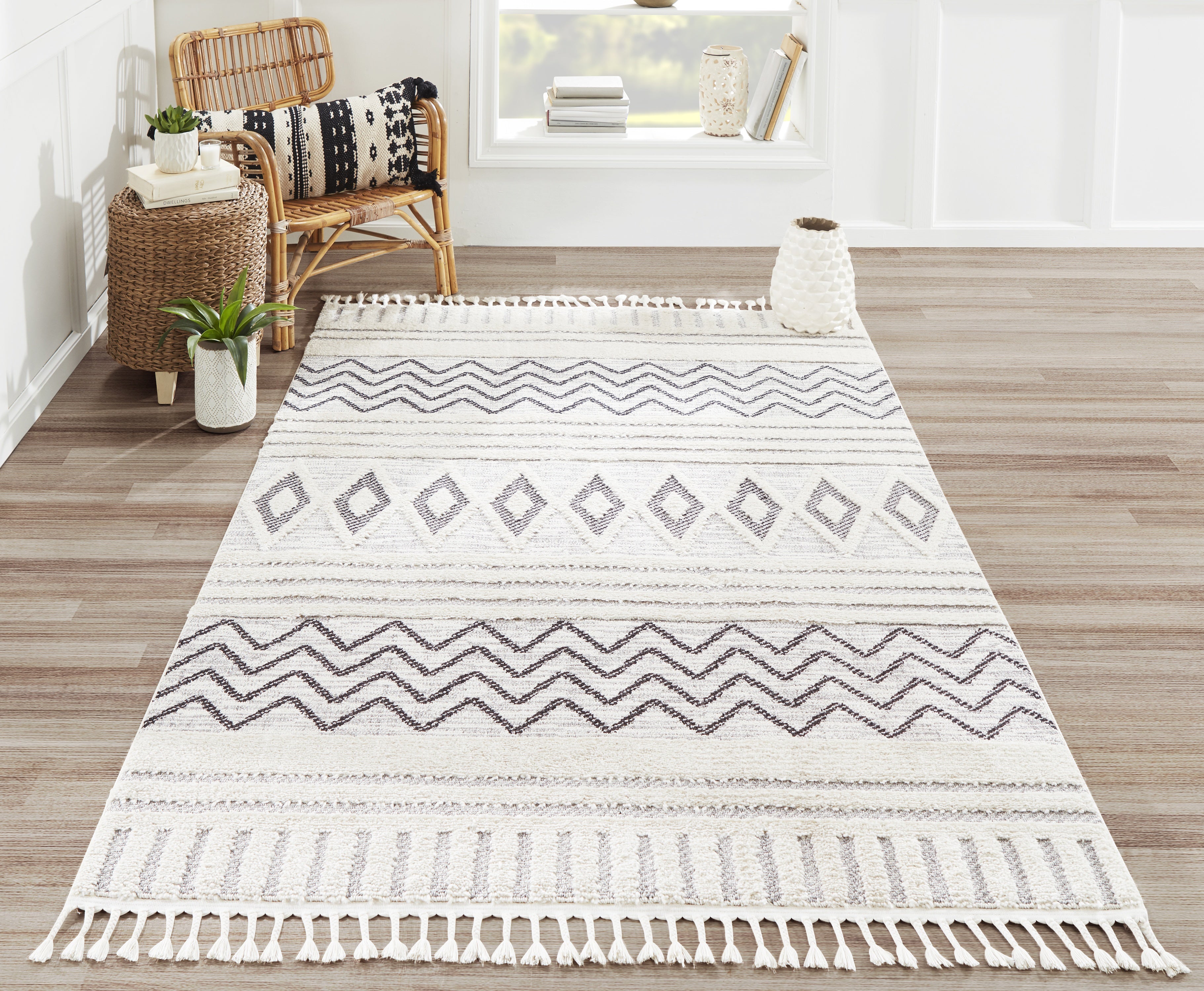 A coastal vibe but with a twist, this rug defies standard style definitions thanks in large part to its white and blue color scheme. Raised plush lines provide sculptural details, while fringe always feels playful and fun. The combination of diamonds, stripes, and zigzags creates movement on your floors. Placed in front of a kitchen sink or in a bathroom, it would be a comfortable addition to your home decor.