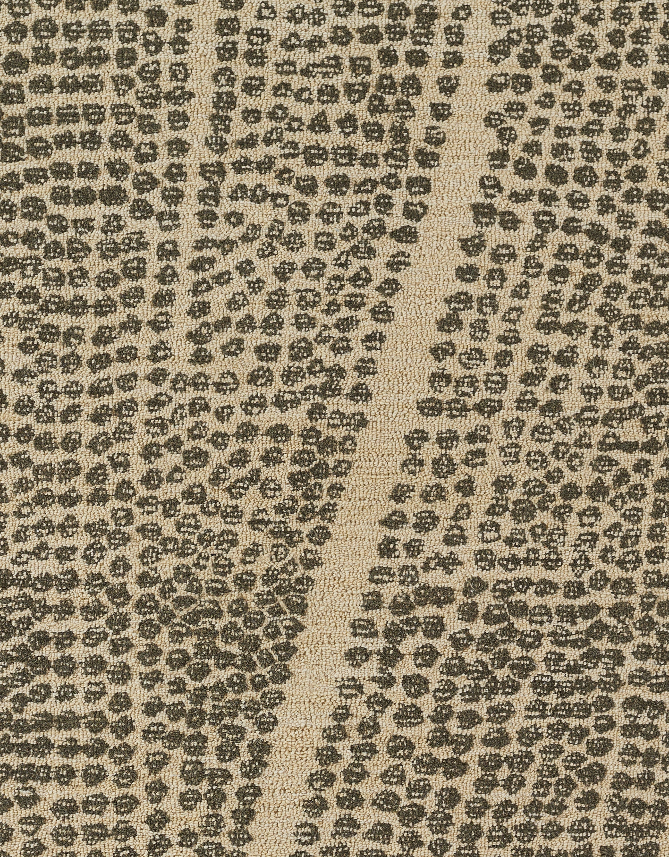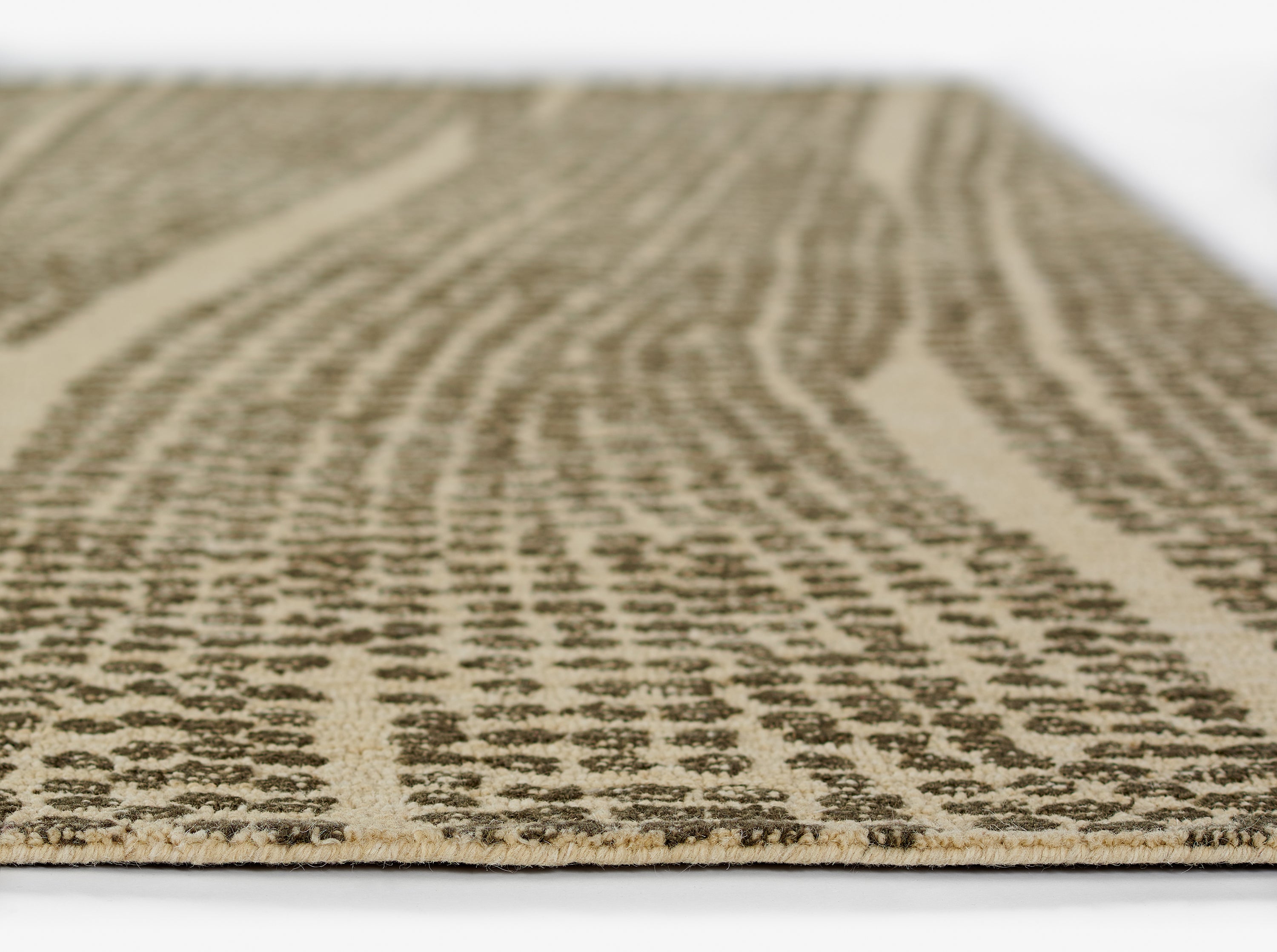 This intricate and organic flowing design was hand-tufted using 100% wool as a featured rug in the Teppe collection. With a warm and natural color palette broken up by sprinkles of black dots, and a special loop pile construction, this rug’s particular style is reimagined from traditional African Bark Cloth designs; it would do well in a home with other cultural decor and rustic vibes.